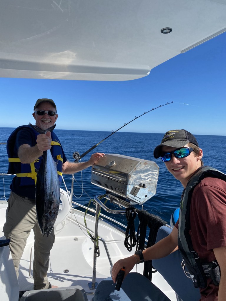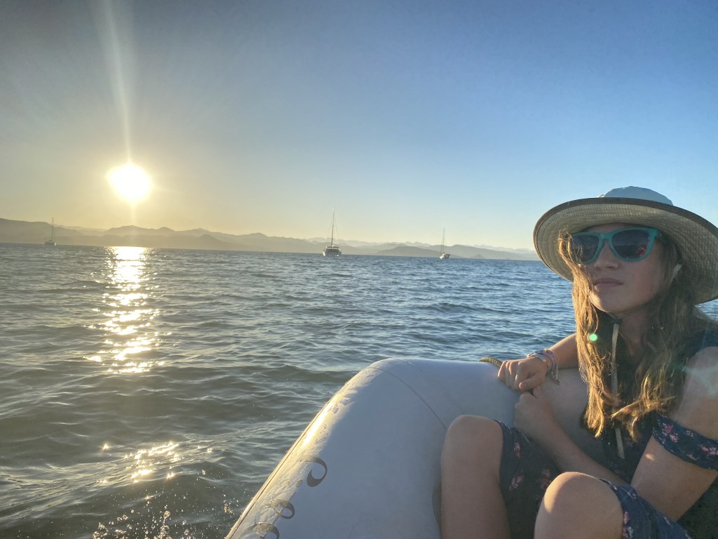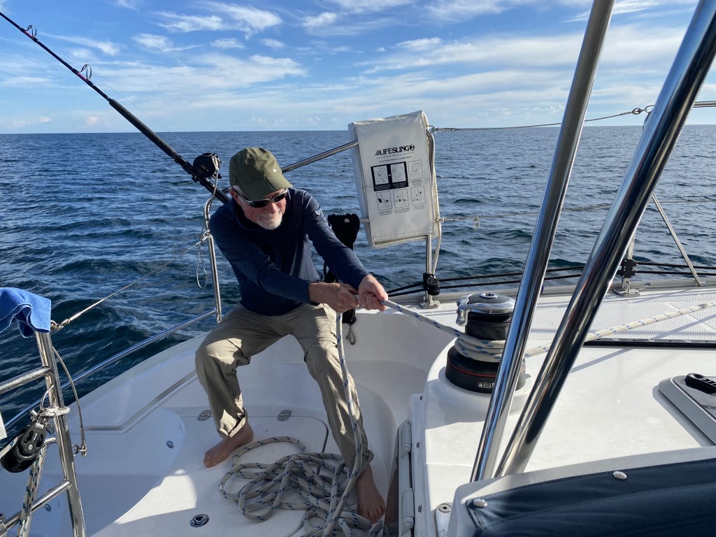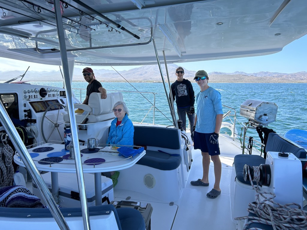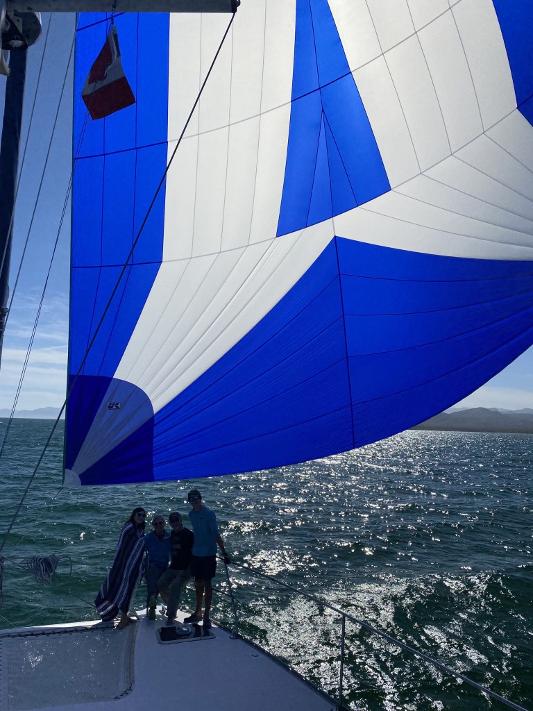 Fantastic downwind sail all day in 12-17 knots of wind, boat hit max of 7.4 knots speed….I’ll share my rambling passage notes for something different:  Up at first blush of light, the land smells overpowering those of the sea.  Do cacti have a smell?  Mingling with unexpected evergreen and dew-moistened desert.  Swells on beam initially, spilled coffee.  Round the point, wind and waves behind us, hoisted the azul y blanco asymmetrical, started moving a leisurely 3 knots.  Now winds 9 and we are making a solid 4.5!  Other boats we don’t know moving in the same direction we are, unspoken race and friendly shaming to get one’s sails up.  We watch as 2 boats also set their asym, we’ve pulled ahead by a mere quarter mile  – the race is on!  Cockpit pancakes underway, the last one a Nutella-rolled dessert pancake.  I’ve set up camp on the sunny deck with my journal and water bottle, Cora still in bed, Calder reading, Chris and Gma at the helm, Gpa monitoring fishing gear.