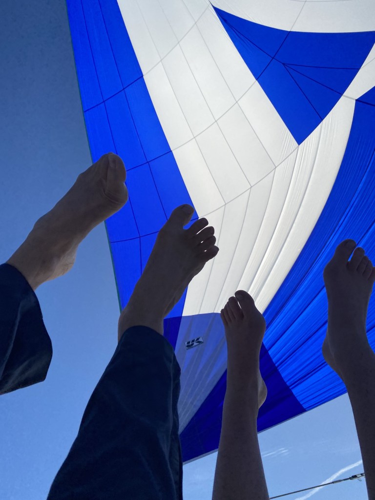 We had a stellar downwind sail in 18 knots of wind, our blue and white asymmetrical spinnaker flying full at a speed of 6-7 knots, so calm that we ate lunch on deck underway – fresh tuna poke and pineapple.