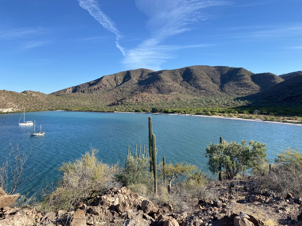 Next stop in Bahia Concepcion was Playa Santa Barbara, a more remote less populated anchorage to explore – mangroves, piles of tiny shells we gathered to make a shell garland, and a hike out to “cactus point” lookout.