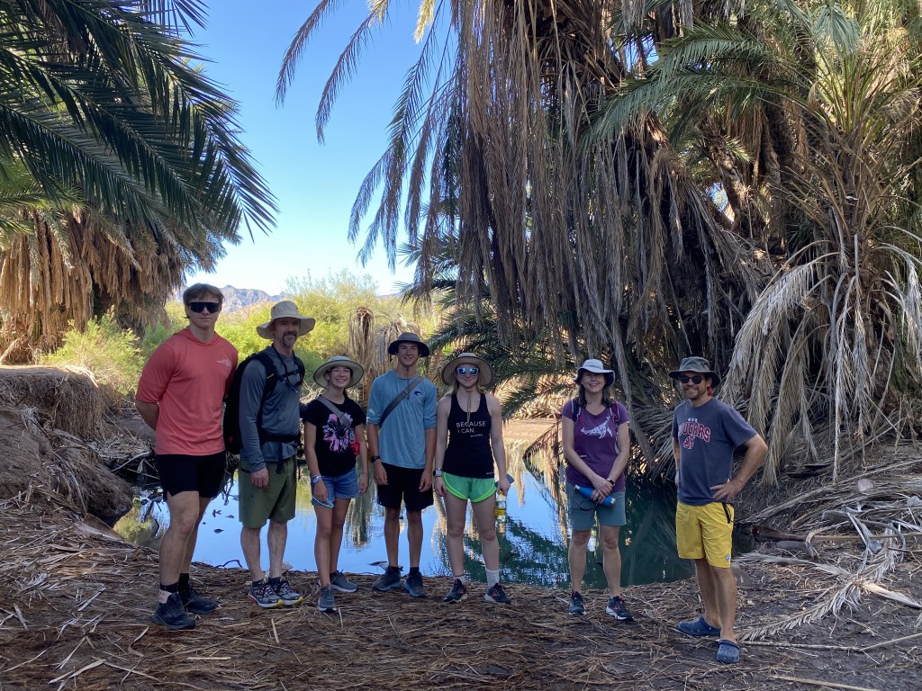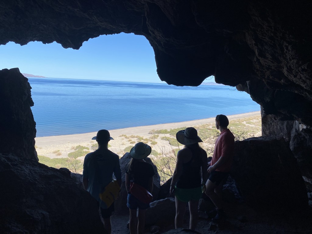 Over to the shore for fish (and mystery meat) tacos and margaritas, before dinking back to the boat in the dark, fish leaping in front of us. We had an uneasy moment when a panga was circling us in the dark, not responding to our greetings, concluding that we were the annoying intruders in his fishing grounds, humbled again. The next day, we hiked through an oasis of palms, across a beach, and up a bluff to a cave with rust-red handprints on an overhang. Our research on this site revealed discrepancies in date and origin (1,000 to 8,000 years old? Cochimi or Mayan?), but appears to be a coming of age ritual of children’s handprints. The ink has remained intact for many years due to its red volcanic rock base.