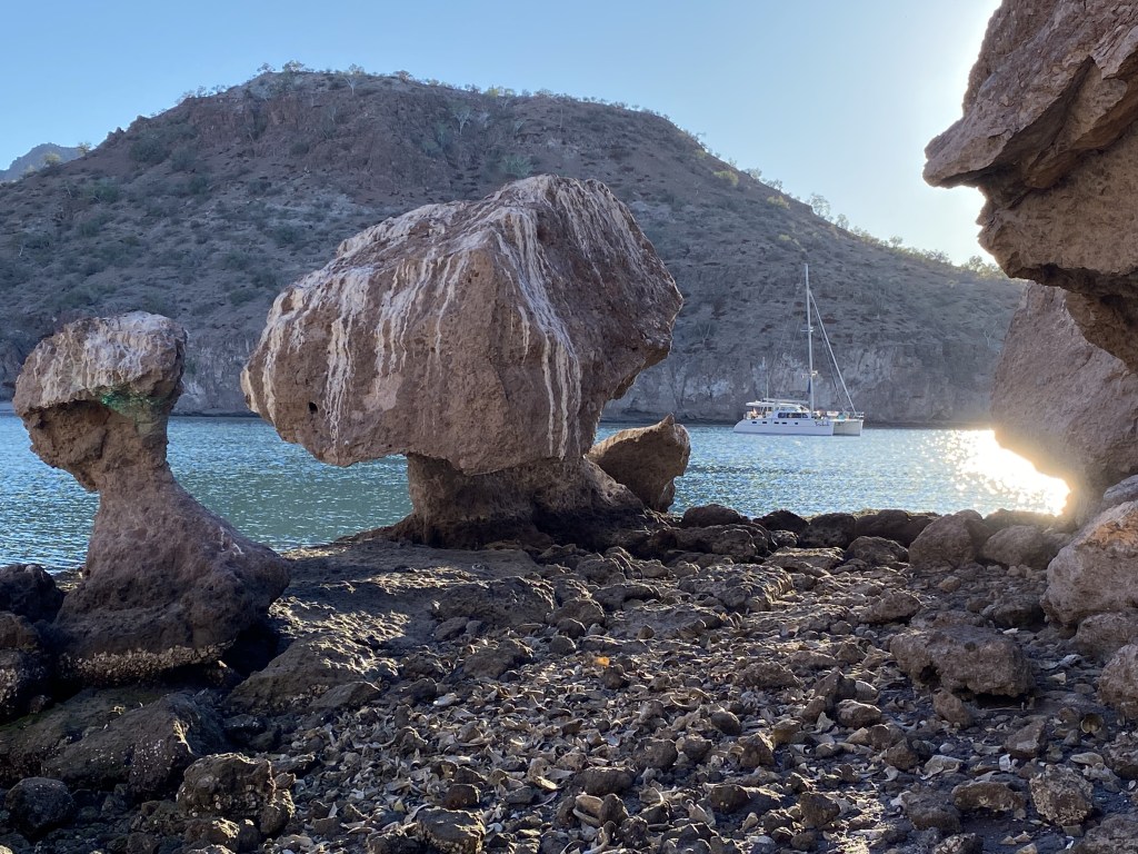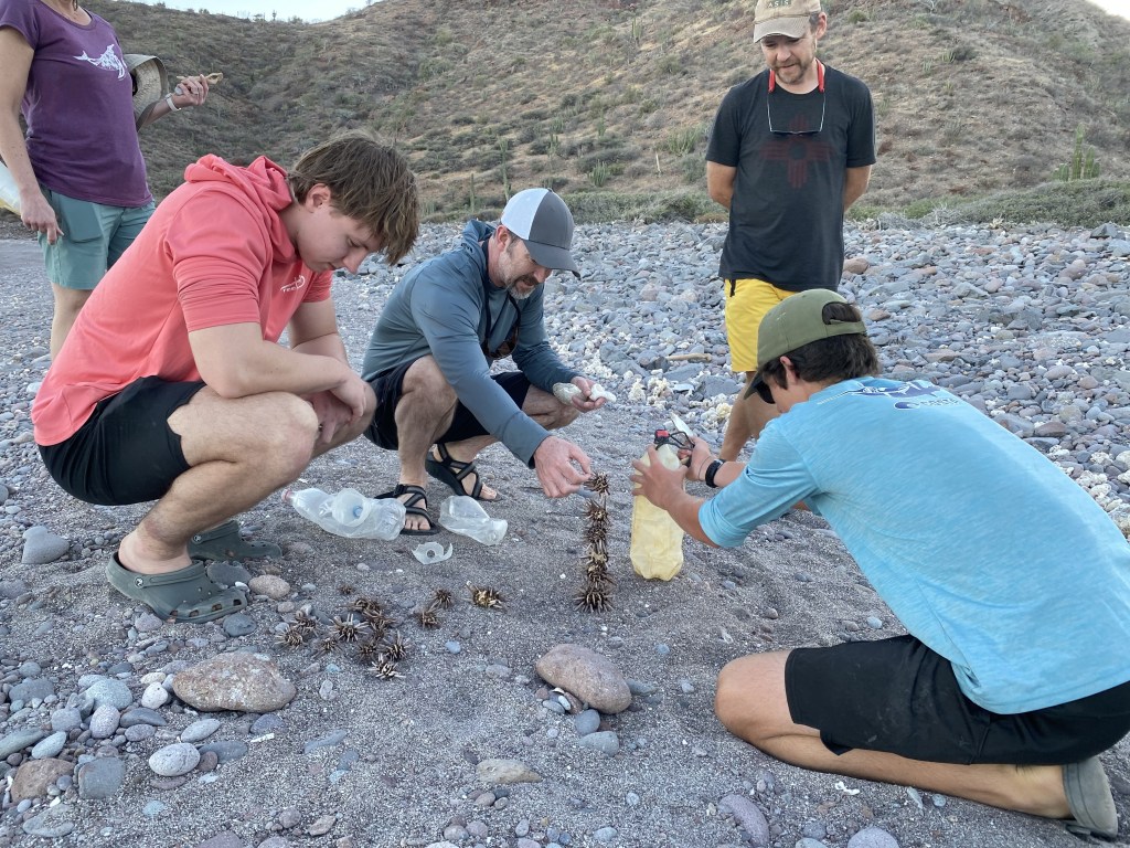 Around the corner into Bahia San Marte for more swimming, paddleboard battles, and beach exploration with treasures from polished colorful cowries to delicate dried violet sea fans. Beach time exploration results in games such as “How many dried pencil urchins can be stacked up?”