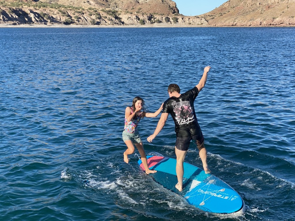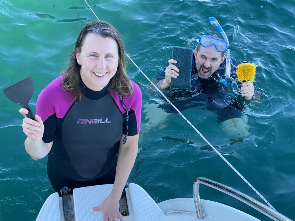 Back at the boat, enjoyed more swimming, paddle board balancing battles, and put Heath to work scrubbing the underwater hull.