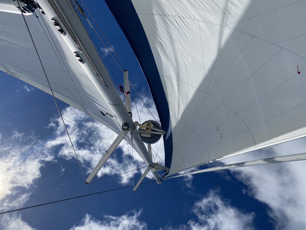 We were able to show off four of our five sails (all except our storm sail thankfully!), starting with a downwind sail using our asymmetrical spinnaker, changing out to our main and screecher when the wind direction changed, and finally our main and genoa as the wind freshened. It’s a rare day we use all our sails and it made for an active experience for our guests.