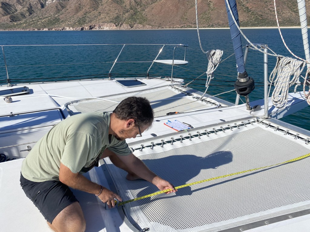 A blue whale’s long body and spout were a treat before it dove, displaying an enormous fluke. The painted cliffs were stunning, and blue-footed boobies soared above. Upon arrival, we spilled out onto the beautiful white sand shore for the afternoon, knowing that we would be “stuck” aboard for the next 2 days, listening to the wind howl and watching our anchor. We were quite happy with our decision to anchor here in the sand with lots of room to swing. The winds howled up to a max of 37 knots, but we stayed cozy and safe, working through school and cleaning the boat. One of the trampolines (the two nets at the front of a catamaran) has decayed over time in the sun and we measured and ordered new ones, not wanting an unexpected fall into the water below.