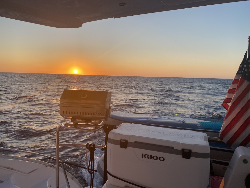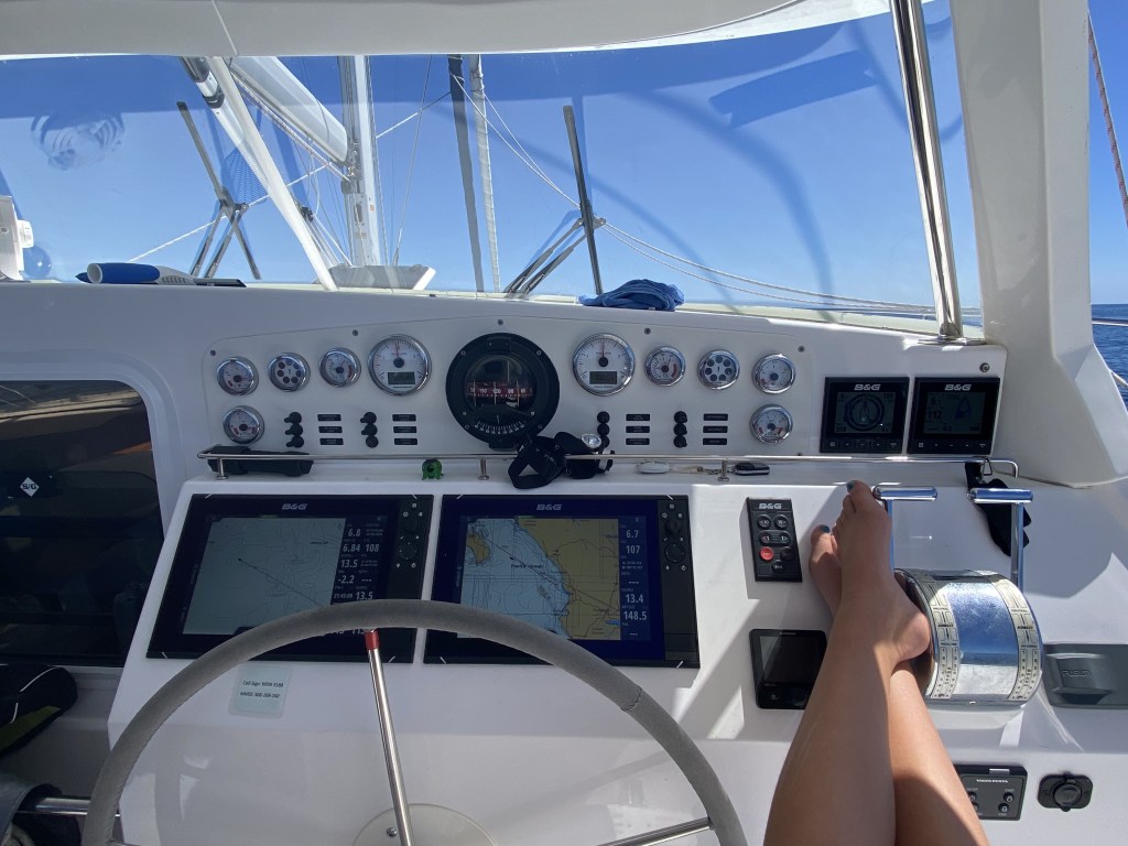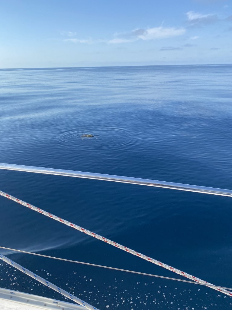 By 5pm, wind died and waves from all directions, felt like we were in a washing machine. As the sun set, the waves grew past the predicted 3 feet or less to a steady 7 feet but the boat handled it well. Lovely to see the moon rise slowly, a friend that kept us company all night. We did 3 hour shifts overnight, Calder and I, Chris and Cora. Mars rose, the sun rose, the moon set. Intermittent sleep.