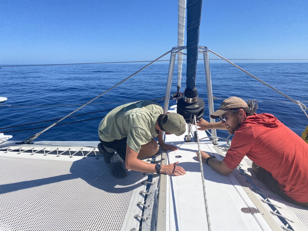 Our loop completed a circumnavigation of Isla Partida and Espiritu Santo. Calder stated, “The cliff colors look like Northern lights!” Surrounded by jellyfish, they washed up on our swimsteps and covered Calder’s fishing lines. Swaths of the water looked purple; a mix of the blue sky and red phytoplankton. Into Cerralvo Channel, we had some amazing sailing, first with our Code 0 (big headsail), then with our asymmetrical spinnaker. It was a comfortable enough ride that I could bake bread and we started Audible “Lord of the Rings.” By 3pm the winds died down, sails down, and we were able to motor at 7 knots; what a difference a clean bottom makes! An hour later, winds up again; asymmetrical spinnaker up again and flying at 7-8 knots. When winds freshened too much to be flying the spinnaker, Calder and I tried to pull it down in 20 knot winds and were pulled off our feet briefly into the air; it took the addition of Chris for all three of us to get it down. Thanks SY Flora for our sailing gloves! Genoa sail up, winds 24, comfortable. It was an active passage with many sail changes in the first 12 hours.