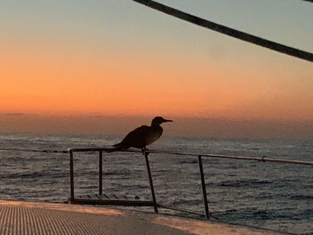 At 1:30am we had a brown-footed boobie bird land on our bow, balanced on the stainless railing in rolling seas, tucked in for a nap. He would occasionally stretch, groom himself, then tuck his head back into his feathers and fall back asleep. He stayed until sunrise when he flew off with another boobie; perhaps was on top of our cockpit cover all night?