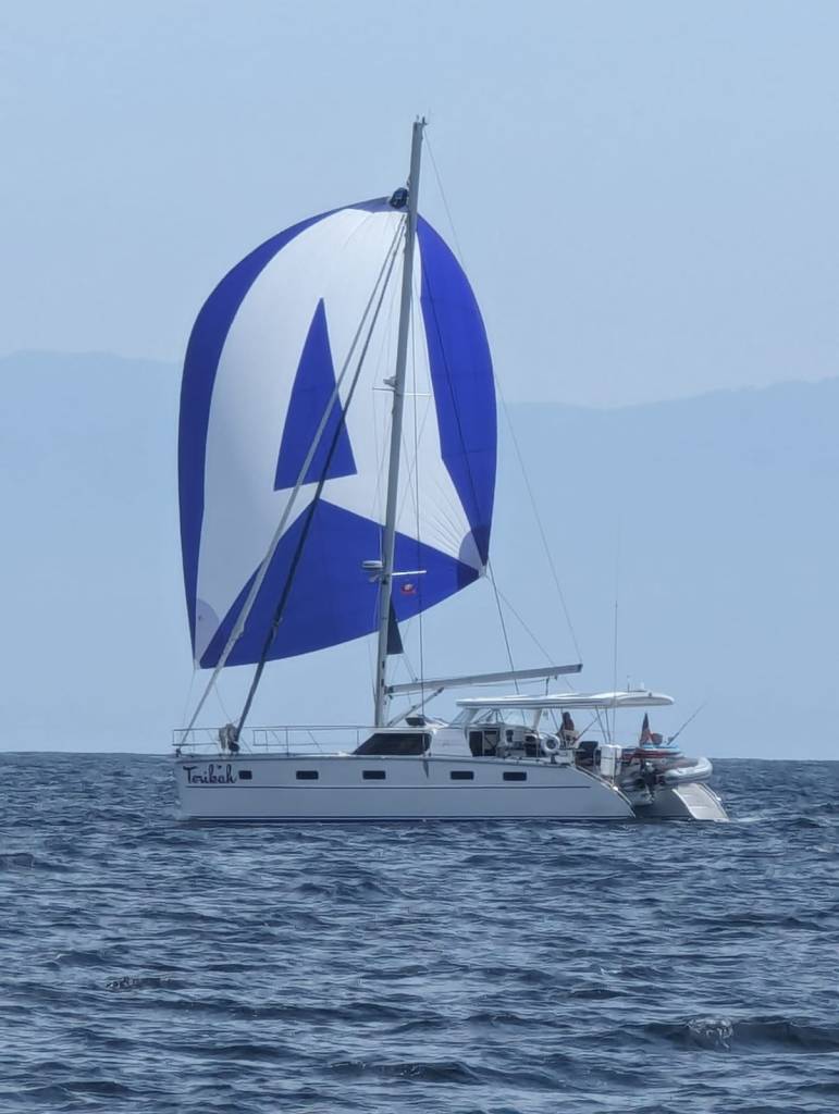 Underway from Chacala, motoring at first, started to play with our asymmetrical spinnaker in light winds, jibed around the point, and had a ripping sail as the winds built to 15-19 knots into the famous and busy Banderas Bay, making a steady 7 knots downwind to our destination of La Cruz de Huanacaxtle.