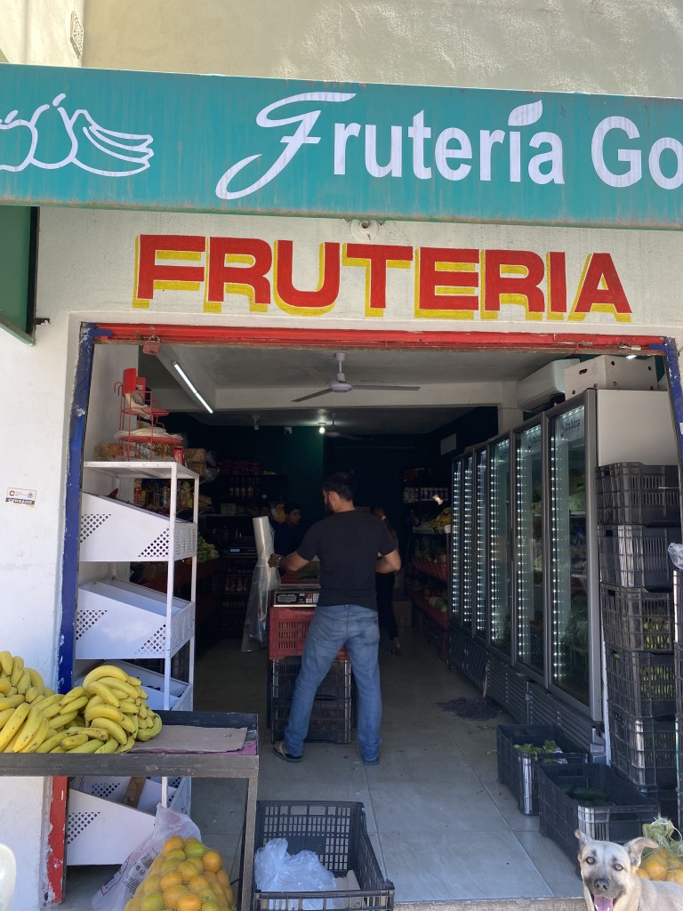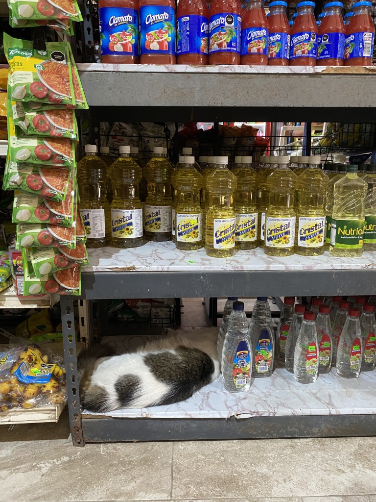 Into town, we bought more produce at the “Fruiteria” and cervaza at a small tienda, a cat curled up on the shelf sleeping next to the vegetable oil.
