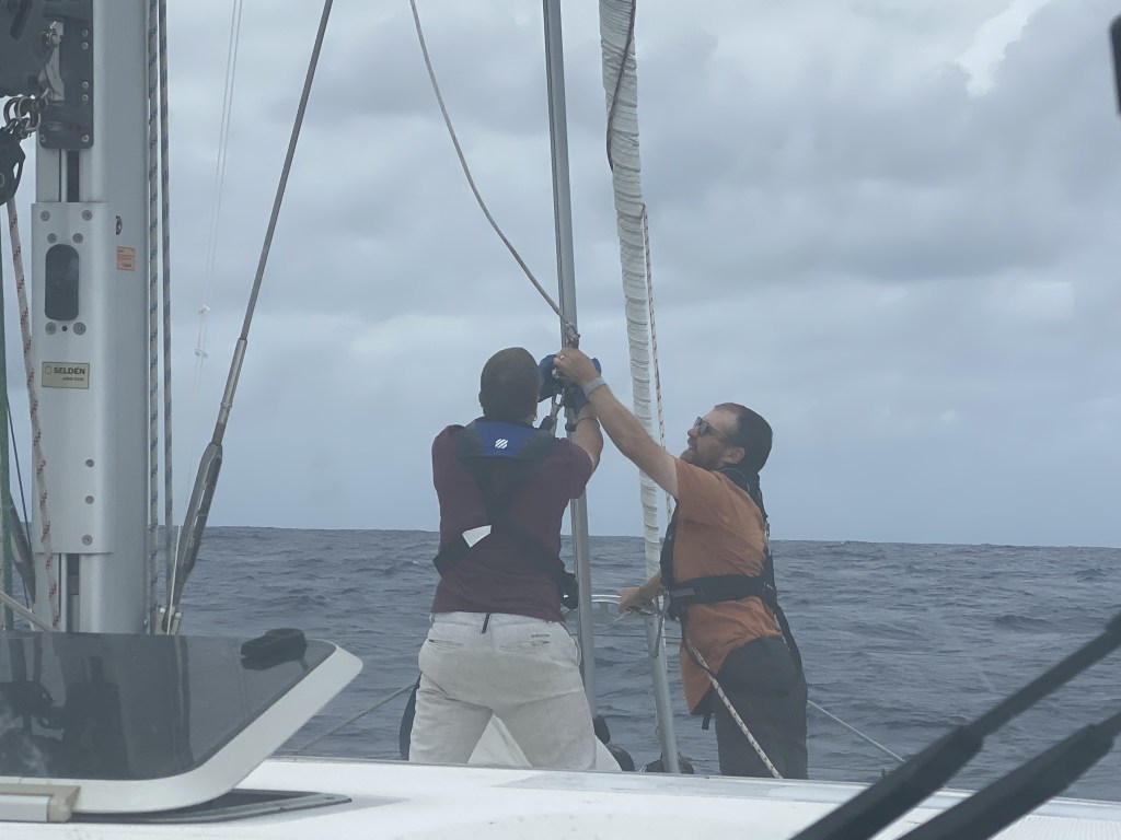 On last night’s watch, we spotted “something” on the radar; got the crew up, the sail down and watched it…dissipate. So this radar blob was likely just rain and we experienced a drizzle. Thankfully no squall, but we are ready. We spend about 2 hours daily looking at weather – winds, rain, currents, satellite imagery, live lightening maps, and CAPE (Convective Available Potential Energy). And we also spend all day looking around at the ocean and sky. The awesome folks from Totem call CAPE “squall food.” We check in with Jamie and Behan from Totem twice daily about our route, navigating all these forces. We are beyond grateful for their knowledge and support; they are truly committed to cruisers having a safe and positive experience.