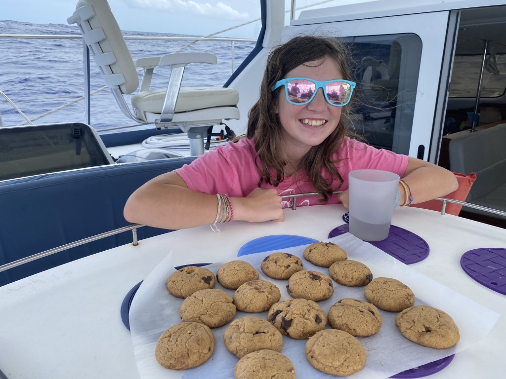 Cora was very determined to make peanut butter chocolate chip cookies. She gathered all her ingredients down in the galley, but the wave action on the port side and the closed port in the galley (due to waves hitting the window) made a stuffy area to work without turning a bit green. She gathered up all her ingredients and brought them into the cockpit, where she mixed and prepped her cookies, the wind gusts fluttering flour and salt into the air. Two hours after the start of her process, we all enjoyed delicious cookies made by Cora.