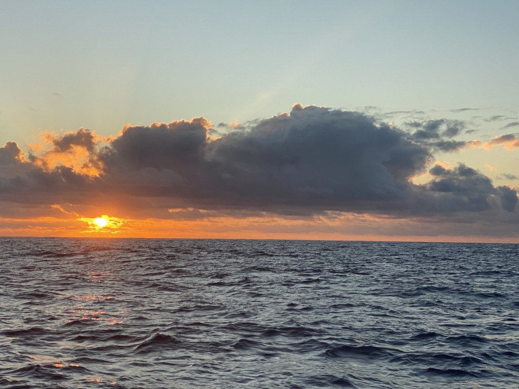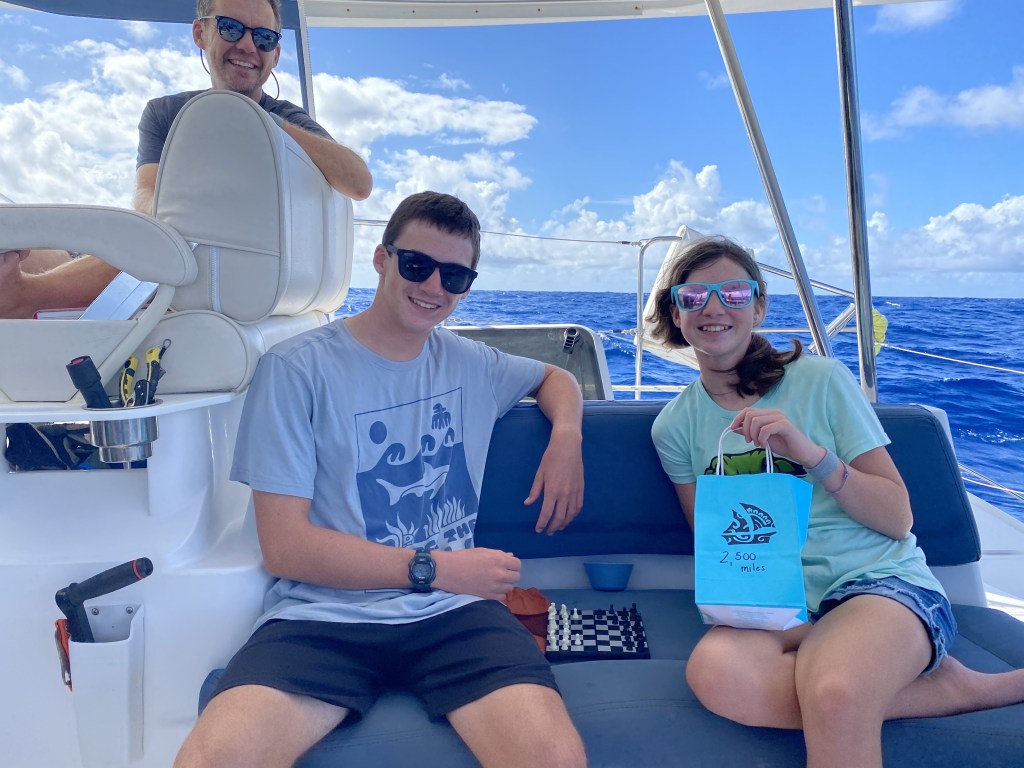 My Aunt Barb asked us what the first thing is we’ll do once we arrive, what we most look forward to. Chris looks forward to watching everyone try to walk a straight line on land. I’m craving pizza with a cold beer on land. I’m looking forward to getting the boat clean, loading up on fresh local produce, doing laundry, and sleeping through the night. Even more, I’m excited to start our exploration of the unique Marquesas islands and culture. Cora is excited to not be moving around and will simply enjoy the still land. Calder wants to get in the water and scrub the hull to get more speed. Emil is having a hard time believing there is such a thing as land, also looking forward to jumping in once we are anchored and being reunited with his family.