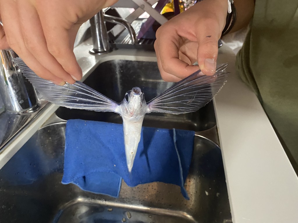 We had a flying fish fly into the boat through a port hatch, funny for Calder to find him on the floor a bit later when getting ready for sleep.