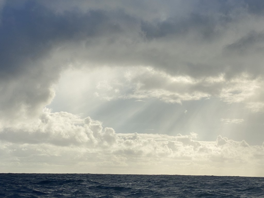 Overnight, the wind and waves built up and we cracked off west (more than south) to keep the building seas on our stern, a more comfortable ride. We dodged a squall line successfully, always so interesting to have winds build at the front of the squall, then drop to nothing at the end of it. It feels so energetic and active, then all the energy is sucked up leaving quiet.