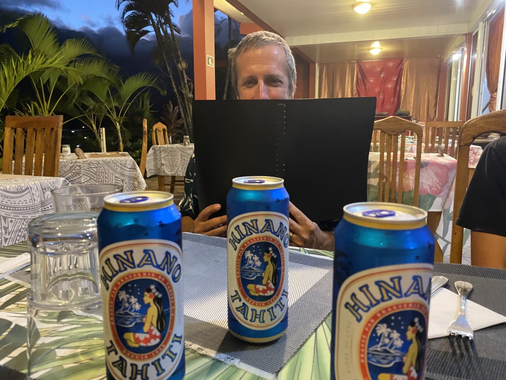 Emil perusing the menu; delicious Hinano beer for us three adults hit the spot