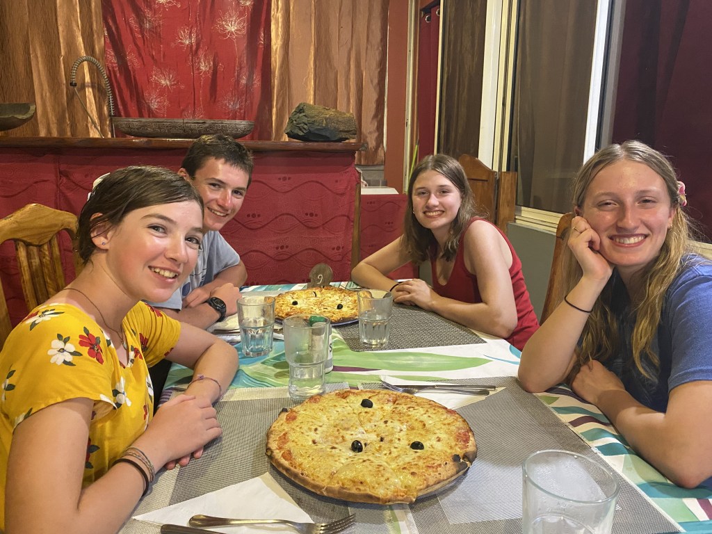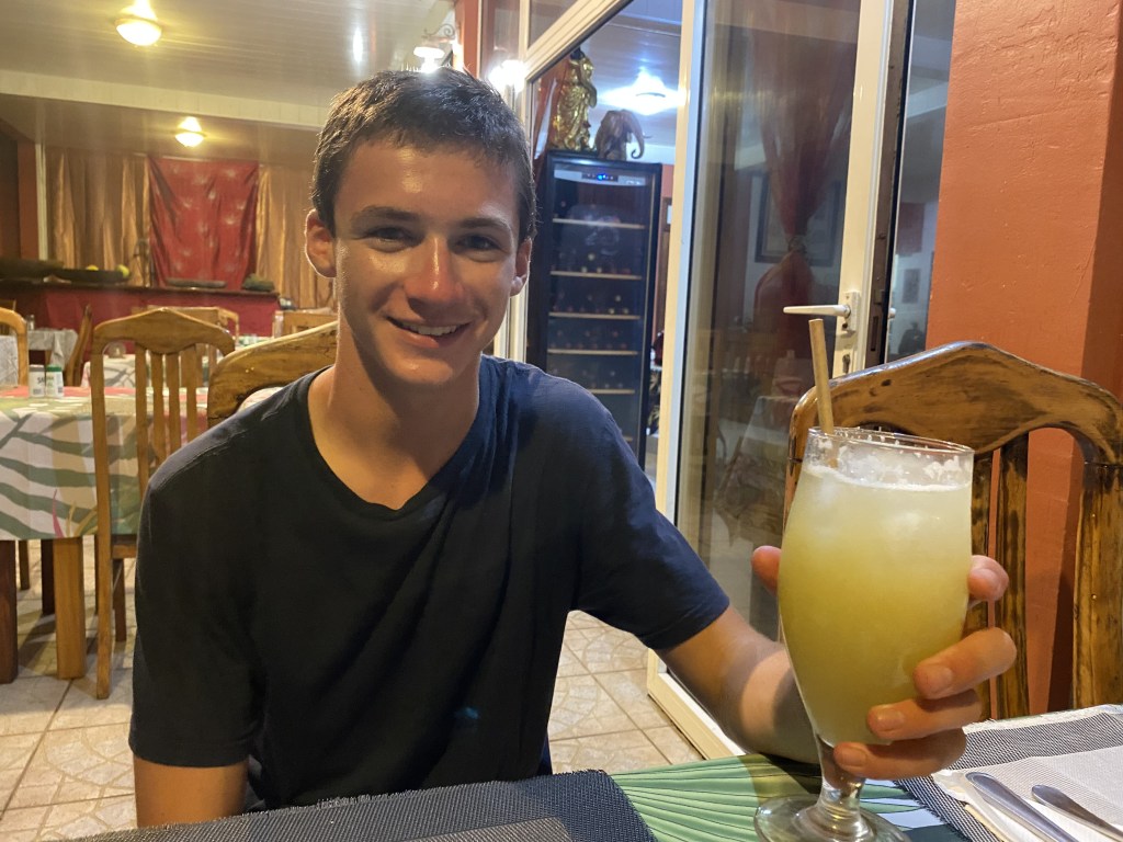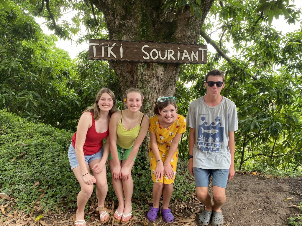 Cora said it felt as if we were levitating as we walked on land, the sensation of movement still present.  Took in the glorious island – sweetness, bright greens, growth everywhere, flowers, fruit-laden trees – stunning!  We walked 2 miles to the town of Atuona for dinner, happy to hand over the cooking to someone else, as we had beer, pamplemousse juice, and pizza.  Yes, pizza.  Pamplemousse is our new favorite fruit that we didn’t even know existed; it is a large, sweet citrus.  They sometimes attract ants and my favorite quote of the night was Calder sucking down his drink happily stating, “It has pulp, it has ants; it’s delicious.”