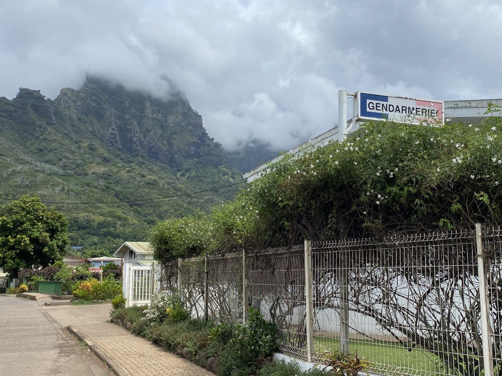 To check into French Polynesia, I had prepared forms online beforehand and now we were meeting with our agent’s representative.  There are various requirements for each country we enter and French Polynesia requires a bond be posted to cover an airplane ticket for each crew member to get home if needed, which is reimbursed upon leaving the country.  However, to avoid this hassle, as well as to obtain assistance in checking in and a duty-free fuel card, we hired Tahiti Crew as our Agency.  This was very worthwhile, as we met up with Sandra in Hiva Oa who picked us up at the dock in her legit Land Rover Defender and drove us barefoot to the Gendarmerie (local police) for the exceptionally easy check-in process.