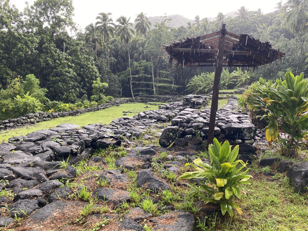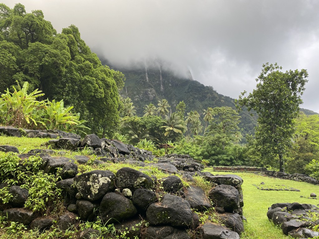 We turned down the mud-stream road to the archeological site of Tohua Upeke, a vast tohua, paved rectangular platforms with several tiers of basalt rows on either side, used as meeting places for festivals, dance performances, and ceremonies.  We never found the tiki in the woods, as the rains pounded down.  The place pulsed with mana, mainly with the low clouds and rain giving it a very mystical feeling.  Waterfalls, chocolate brown, cascaded down sheer high volcanic cliffs.