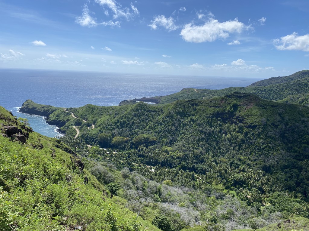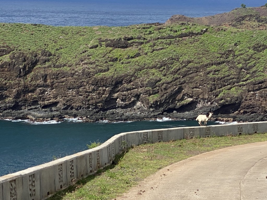 Lush green fringed serpentine roads along turquoise bays, winding around tendrils of steep lava valleys, from Atuona northeast through the island villages of Anahi, Nahoe, Eiaone, and ending in Puamau. Stopping along the way to awe at vistas, we learned so much from Yoan (fluent in French, English, and German) about the culture of these islands we are growing to love with the exceptionally generous Marquesan people. The roads were mostly paved about 3 years ago. Along the way, there were many goats and we saw a topic bird with its long white tailfeather trailing behind.