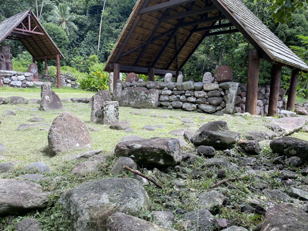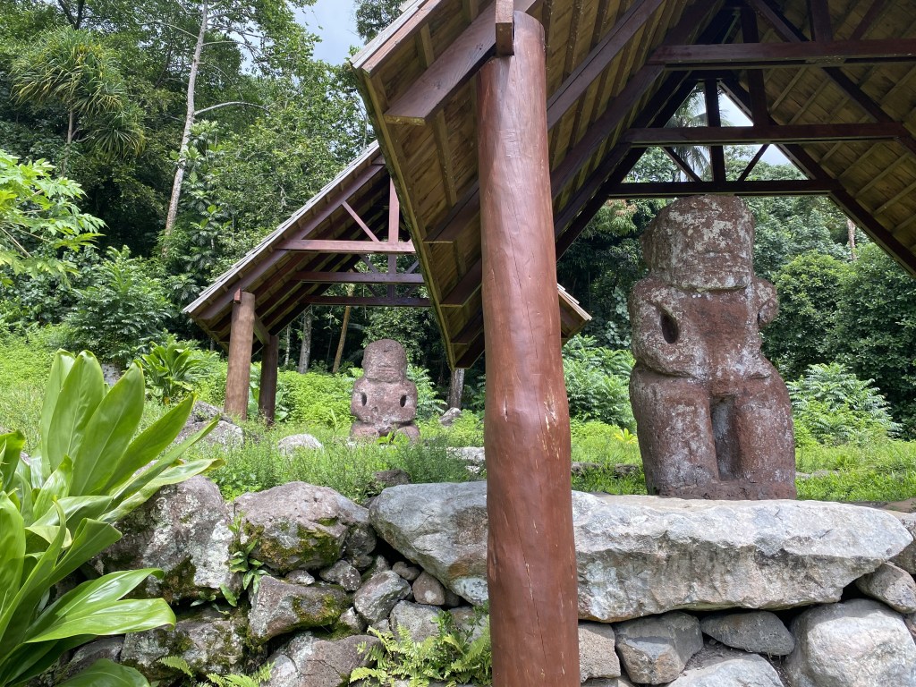 On to the “main event,” Iipona, one of the best-preserved archeological sites in French Polynesia with five monumental tiki. Tiki are carved humanlike statues, the height of which varies from 1-3m. First, there was a reclining tiki; some experts believe it represents a woman giving birth, however there is a petroglyph of a dog/goat/llama on the bottom that is unclear in its meaning. Next, standing at 2.67 m is the largest ancient tiki in French Polynesia, named after a warrior chief renowned for his strength (photo at start of this entry). Next to him on a lower platform, missing it’s head, is another large tiki. Further back is a tiki sitting with her legs stretched out, likely the warrior chief’s wife. Finally, the fifth tiki, is a female with clear hands and smaller size. The site is considered a me’ae, places of worship and human sacrifice with access restricted to a few priests or chiefs endowed with mana (spiritual power). Also visible were pae pae, platforms of stone blocks on which ha’e (human habitations) were built. On one platform were several chunks of phallic stones which were indeed, phallic. The missionaries believed the display of the penis on tiki was immoral and broke them off, casting them into the nearby river. Many, many years later, these were recovered from the river and are now on display. Now, tiki artists, like the one we met earlier today have started to display the male tiki in all his glory, actually enlarging the phallic symbol even more than in the initial tiki.