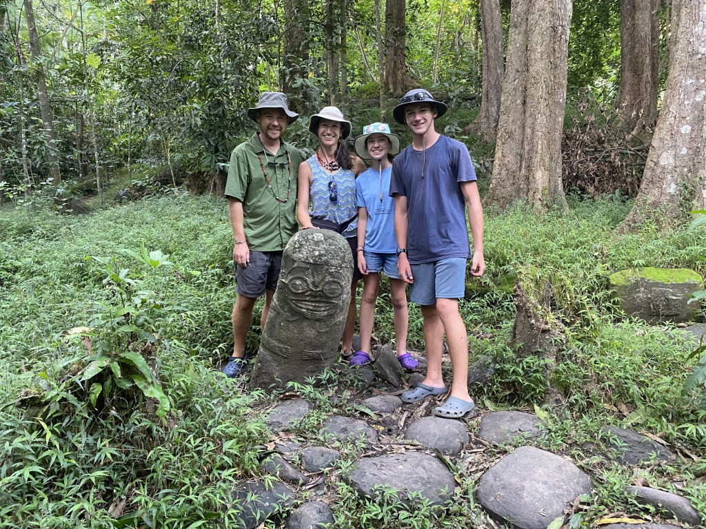 On our drive back, contented with yummy food in our stomachs and the intoxicating scenery, we made one final stop. After pulling over, we walked down the road and through the woods to the “smiling tiki,” who is actually believed to be a wise female spiritual leader speaking (not really smiling). Next to her, a feminine petroglyph could be seen. As we heard mangos falling around us, Yoan showed us how to protect our heads when walking through mango groves, though he cautioned us to move quickly past breadfruit trees that can be vicious when they fall.