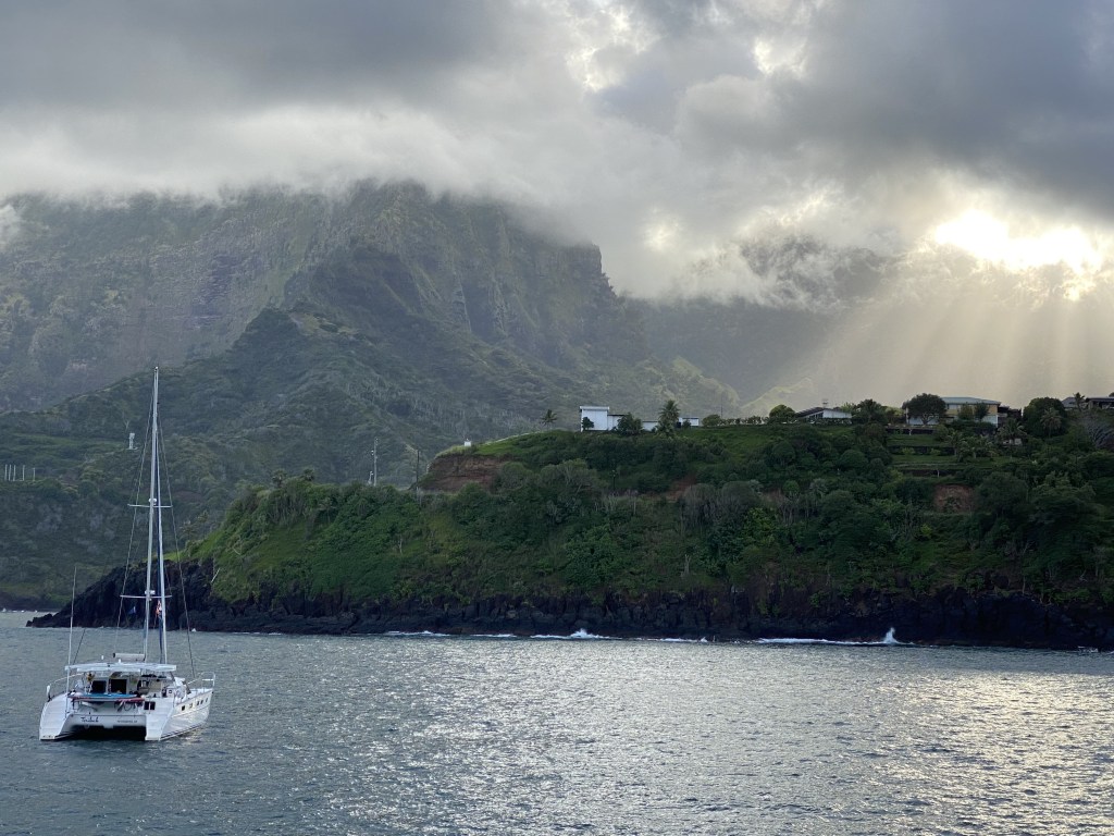Before departure from Atuona, Hiva Oa; the clouds and rain squalls add to the mystical feel here