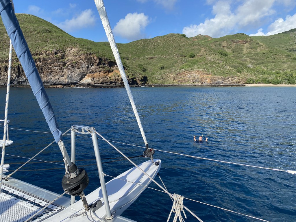 For the time being, we enjoyed this little indent of a cove with one other boat lined with volcanic rock and a small white sand pocket beach. The rocky shoreline right off our boat has a blowhole and the rumbling sound and rainbow spray is entertainment enough.  We jumped into the water, Chris snorkeling out to check our anchor, something you do here to ensure your anchor is set in good sand and avoiding coral.  He didn’t like our holding and we were on the edge of some coral, so we reset the anchor, and he was happier when he dove on it again.