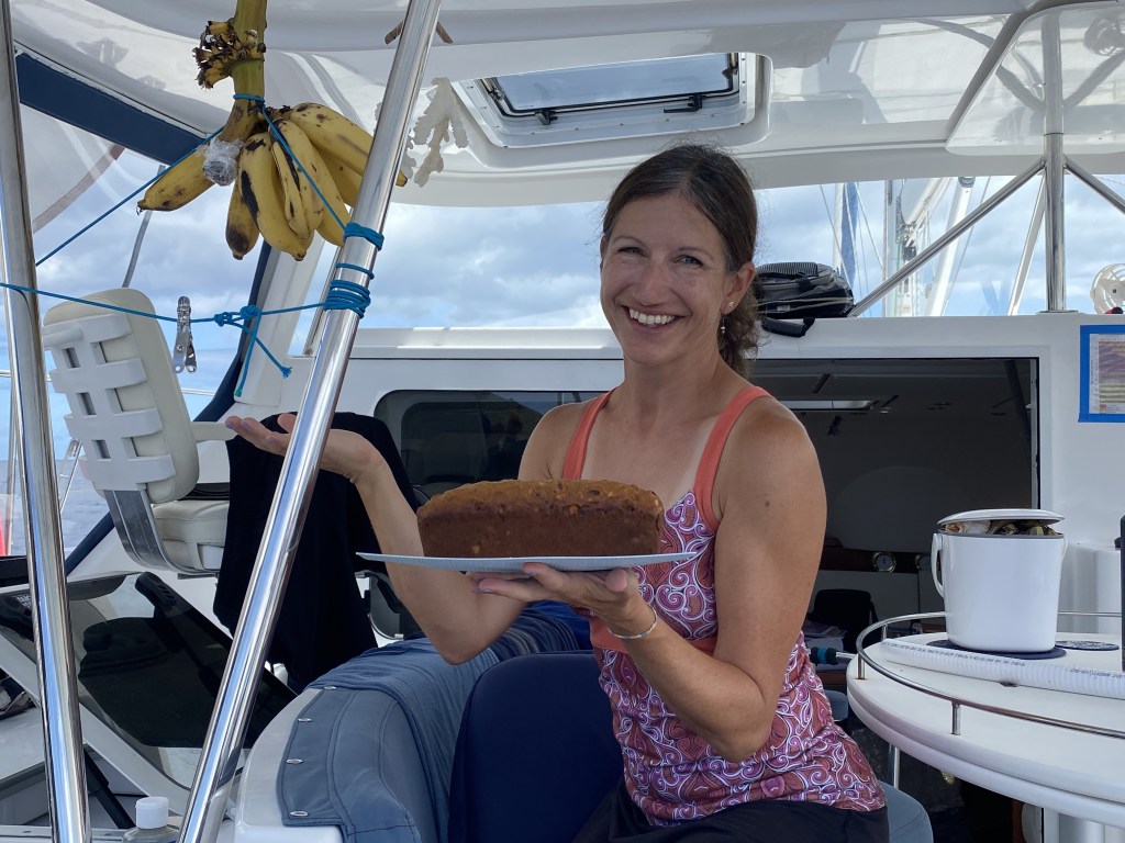 Woke happy to be on the leeward side of Tahuata, hiding out from the bigger winds this week.  Spent the morning working on school and using the bananas that are falling from our bunch; banana pancakes for breakfast, banana bread with lunch.