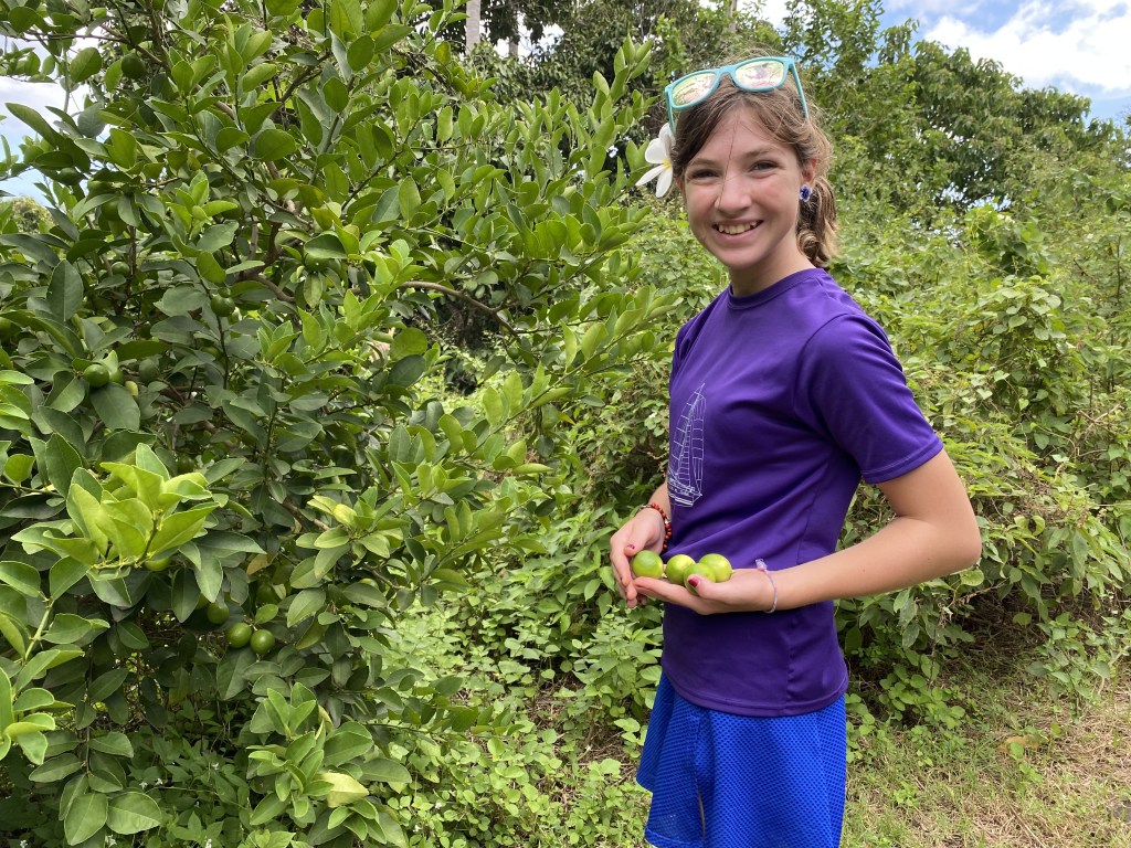 It’s been nice to change our daily schedule, going to bed earlier and waking up around 6:30 with the light, even Cora.  It gives us the mornings to work on school with plenty of time in the afternoon to explore.  Today, we went for a walk up the hill overlooking the bay with our friends, picking fruit along the way.  Calder showed some awesome skill in harvesting mangoes, hitting one in a tree to make it fall with a rotten mango, then catching the good one as it fell from the tree in one smooth move.  He also did some vertical jumps to harvest more.  We picked a pile of limes that we hope to bake something yummy with.