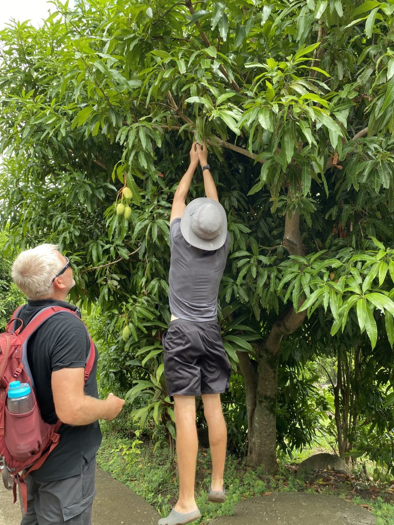 Calder showing his vertical jump mango-picking skills to SY Flora Ralf