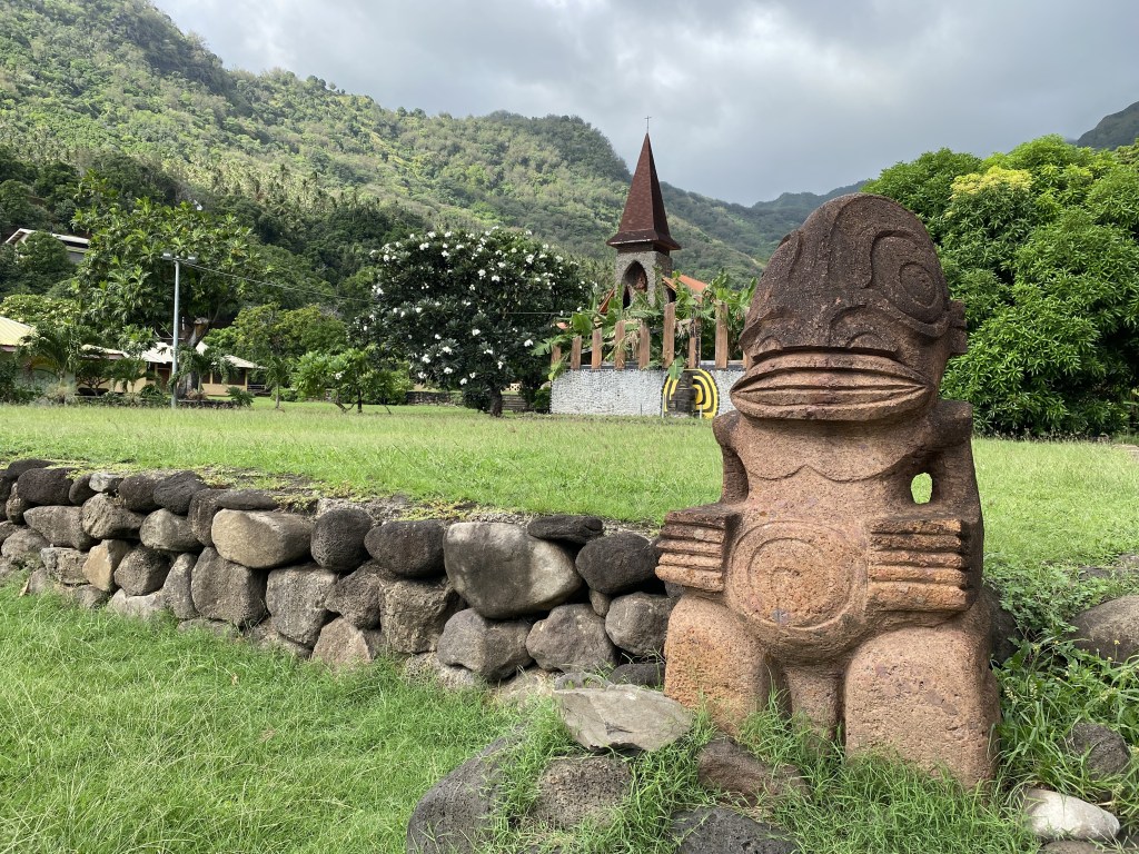 Next to the church is Tohua Iotete (after Chief Iotete) with numerous tiki.  Tohua are the large, rectangular ceremonial plazas, constructed by tribes for public ceremonies.  The Catholic Church is built near (or on) this sacred site.  The juxtaposition and combination of these Catholic and traditional Marquesan images seems to demonstrate that perhaps a comfortable co-existence and melding has taken place.