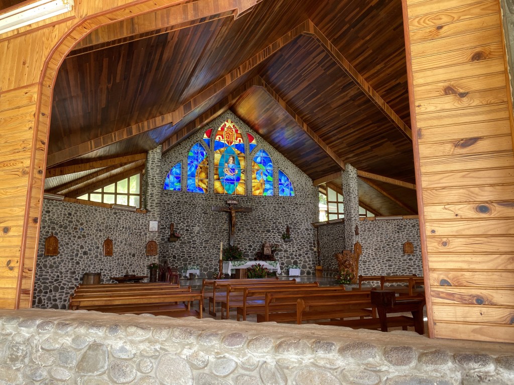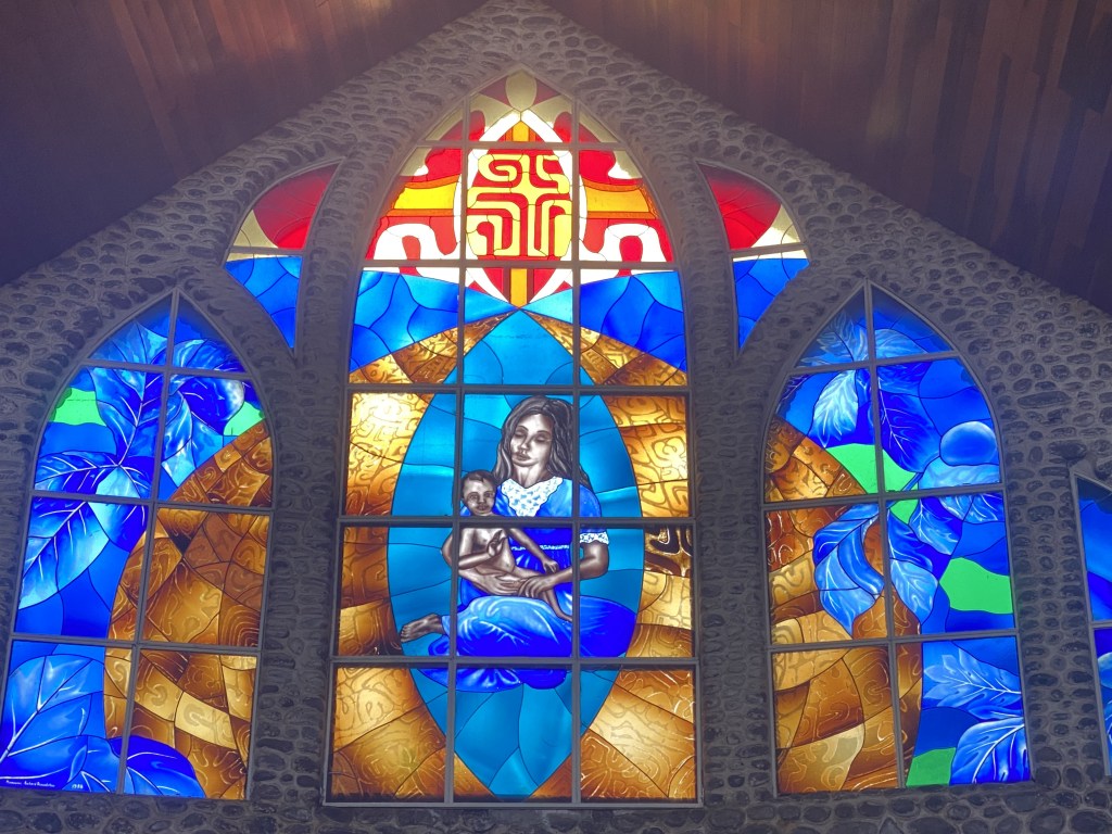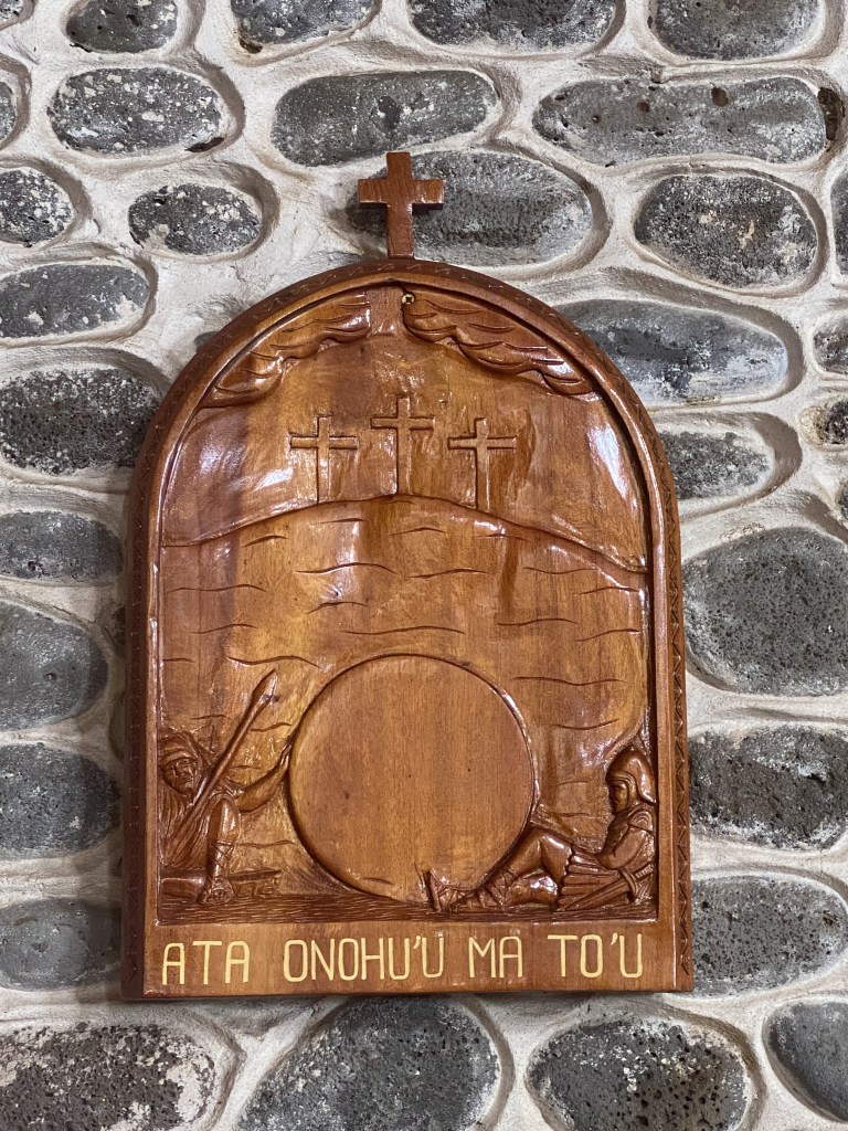 It is fascinating to see the images of Mary holding Jesus with a breadfruit in his hands and the Marquesan cross (not a typical Christian symbol) painted on the wall. The Marquesan cross’ original name peka ‘enana can be translated as “cross of the people,” or also posterity. It’s a symbol for peace, balance, and harmony.  The doors with carved people holding hands form the motif called ani ata, which often represent the sky as well as the ancestors guarding their descendants.