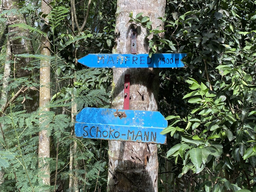 We go past honeybee houses, goats, and hogs. And then two blue signs: “MANFRED 1500m, SChoko-MANN.”