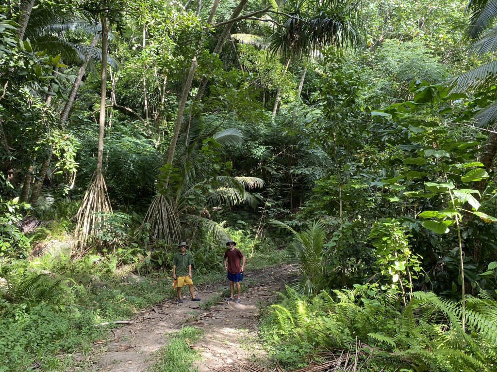 We walk another bit and come to another blue sign that reads simply: “MANFRED” with an arrow. We continue on, pass under a blue arch “Manfred Ville. TUKUA.” We have found the chocolate man and are now on his off-grid property in the jungle, where the 71-year-old German man lives with his Polynesian wife, chickens, cats, and dogs. Yes, we’ll sit at the bench and eat chocolate in your outdoor kitchen. He speaks some English and conveys that he’s lived here for almost 30 years, did all the work by brute strength (asks me to feel his biceps), and used to run the powerlines here as a helicopter pilot. This dude is totally legit. And this scene is totally out there.