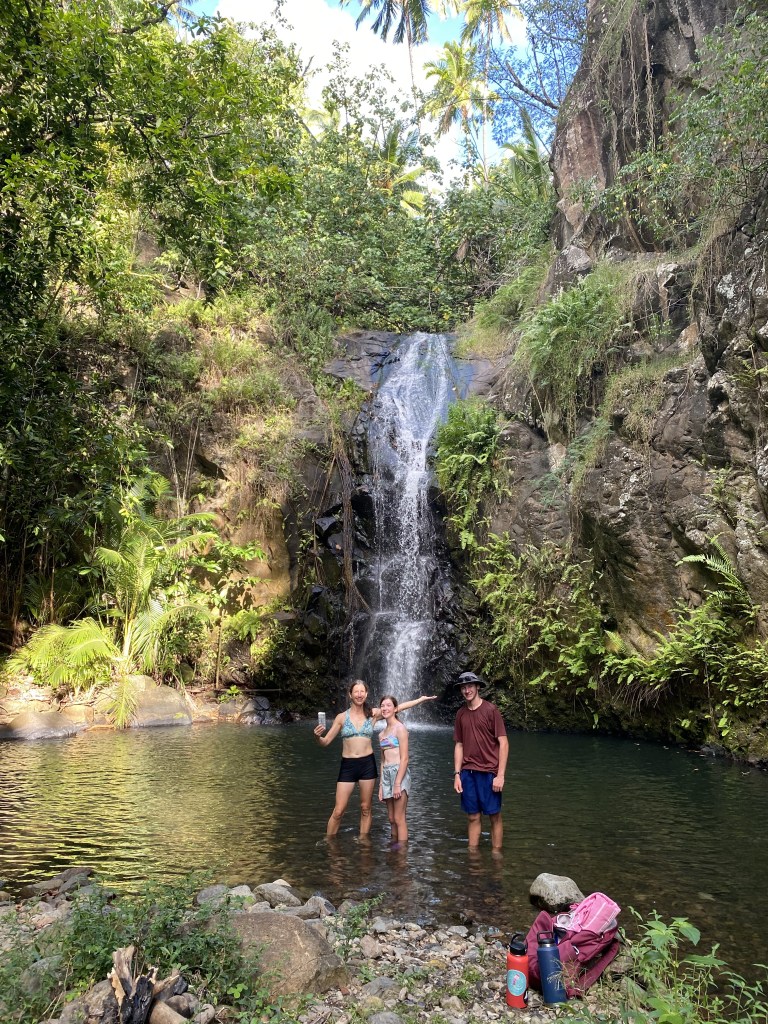 A small trail winds through the valley and across a stream to Cascade Vaiea; a picturesque waterfall cascading into the perfect swimming basin below.