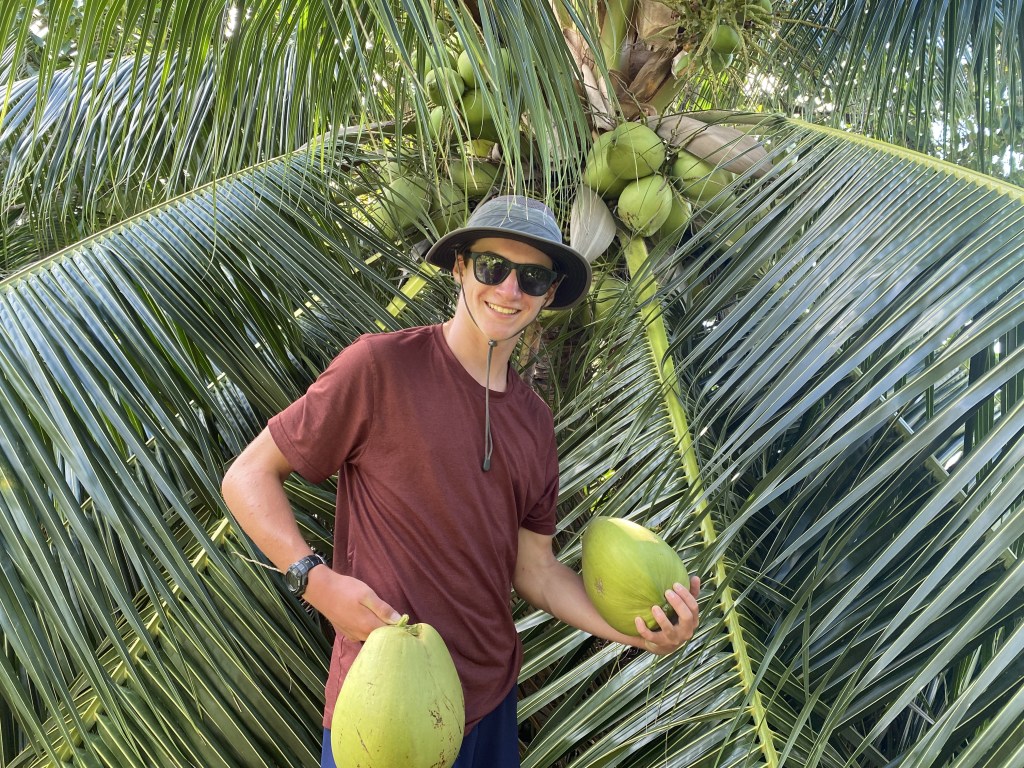 Just like in Mexico, villages seem to have numerous small grocery stores and we did the circuit of them all, each a bit different in their offerings. I was excited to find eggs, apples, saltines, canned tomatoes, and cheese; success! Back at the boat, we dug into the coconuts, the kids drinking the water and all of us eating the meat. Calder worked on cleaning up and sanding the nut into a bowl for me as a birthday present.