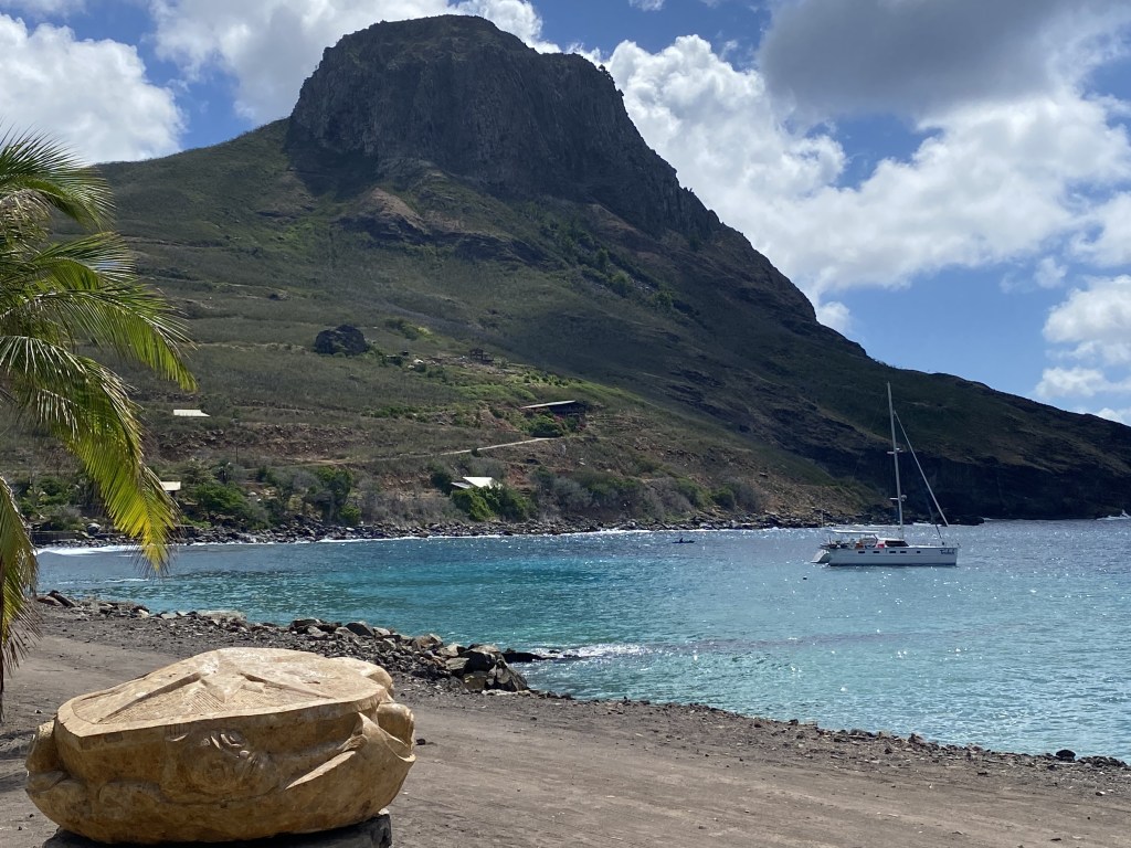 There were already 6 boats behind the breakwater, but we anchored just outside this and set a stern anchor; pretty comfortable and the swell minimal. Hakahau is Ua Pou’s largest settlement and the third largest village in the Marquesas, set in a valley surrounded by more spires; it is clear why some call Ua Pou “Cathedral Island.”