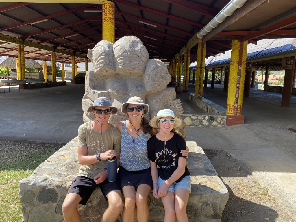 Back to town to find the Centre Artisanal, which had 3 large rooms full of tables, each with an artist’s name and location with their artwork; stunning. We bought some Confitures Goyave vanille (guava vanilla topping), shell earrings for Cora, and another seed anklet and earrings for me; enjoying chatting in French, Marquesan, and English with the ladies working there. Outside the building, an artist was carving large painted seeds with various designs and Cora picked one out that he carved her name into, then had Calder pick one out for himself for free…oh, and here, have two pamplemousse from my yard too. So generous.