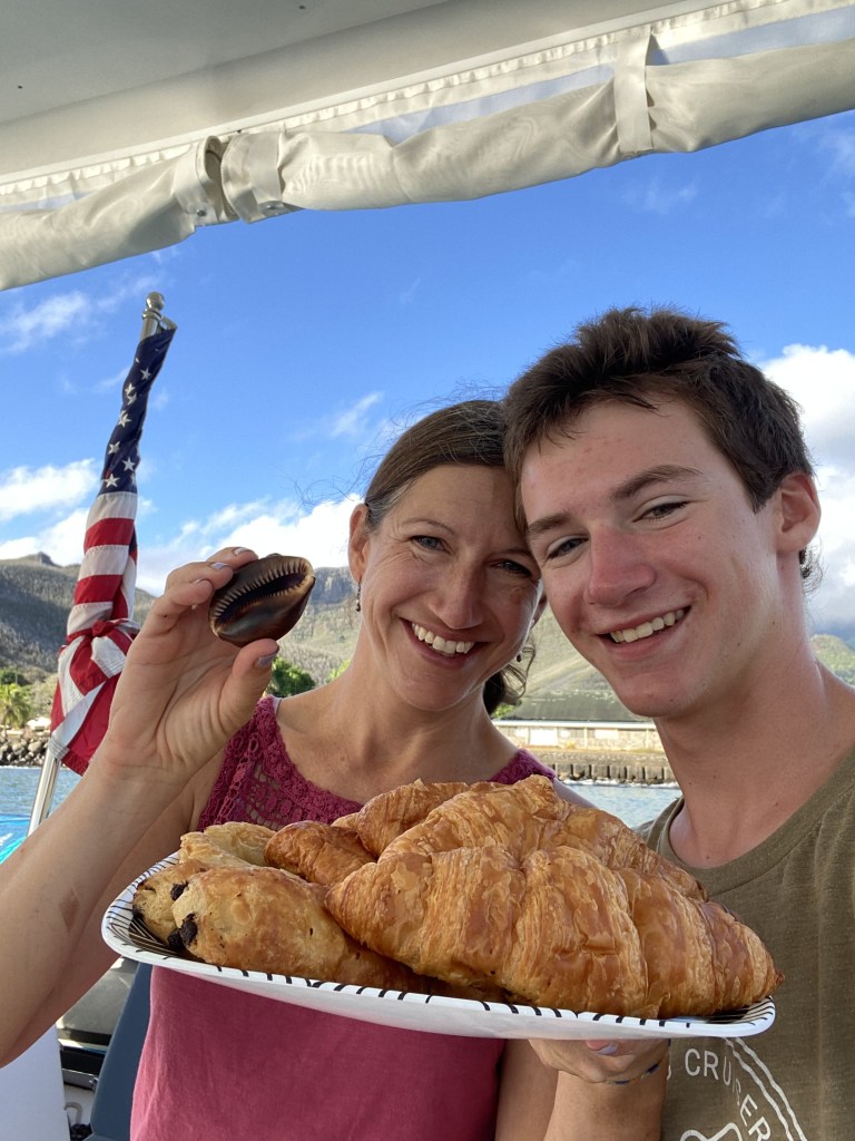 Woke up Calder early to get to the boulangerie (bakery), which was busy with local students by the time we arrived at 6:45am. We picked up numerous goodies, namely excited about our first French Marquesan croissants. As we walked back, we managed to devour a few buttery treats. Walking on the beach, a large beautiful cowrie washed up, presenting itself as a gift from the ocean.