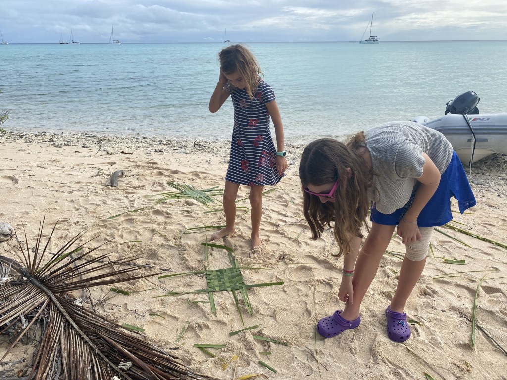 After anchoring and having lunch, Cora and I went to shore to find a good camping spot for the kid boats in the anchorage and us. We found one very fast and, soon, all the kids were building a shelter. Unfortunately, due to high swell, the water level rose higher than the high-tide line and took our first shelter. The next day we built an elaborate campsite and a large shelter, planning to spend the next night out. Right at the time we had chosen to start our campout, 4 dinghies left the boats almost down to the second. We harvested coconuts, set up hammocks, made a fire to cook wahoo and bread dough, and the younger kids went tribal, chasing each other with sticks and yelling, “SACRIFICE!”  Luckily, no sacrifices were made. From my hammock, I could look through the shrubs at night and see the Southern Cross. In the morning, we packed up camp, trying to leave no trace but we left our coconut lined paths throughout the palms. This camp-out felt very normal amongst the new and different experiences of this trip. (Calder)