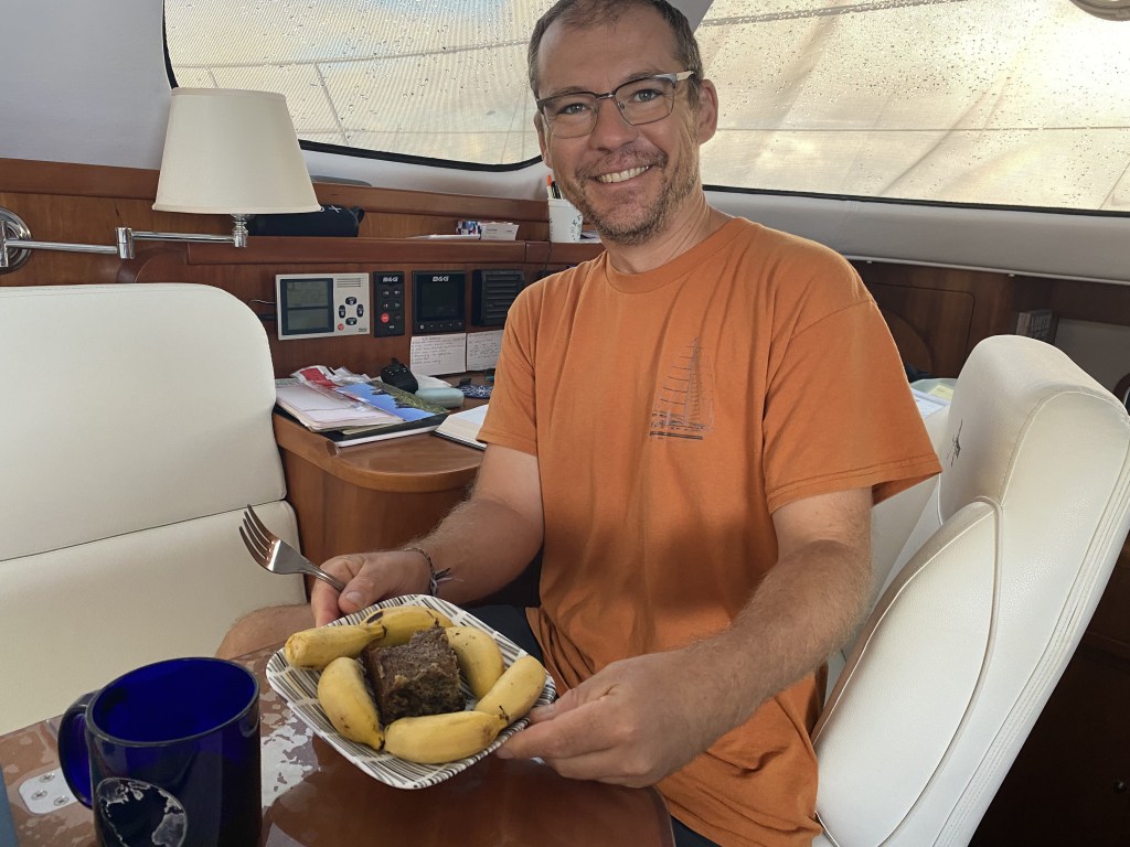The next day, winds and rains heavy in the morning.  When life gives you loads of rain…you can fill your freshwater tanks and find leaky areas.  When life gives you piles of suddenly ripe bananas…you can make banana bread.  And this is what we did with our morning.