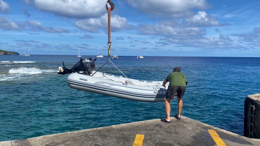 He then climbed out and we used the crane to lift Little T into the air.  We parked her in a dinghy parking spot next to our friend’s dinghy and put the crane back into position for the next boat.