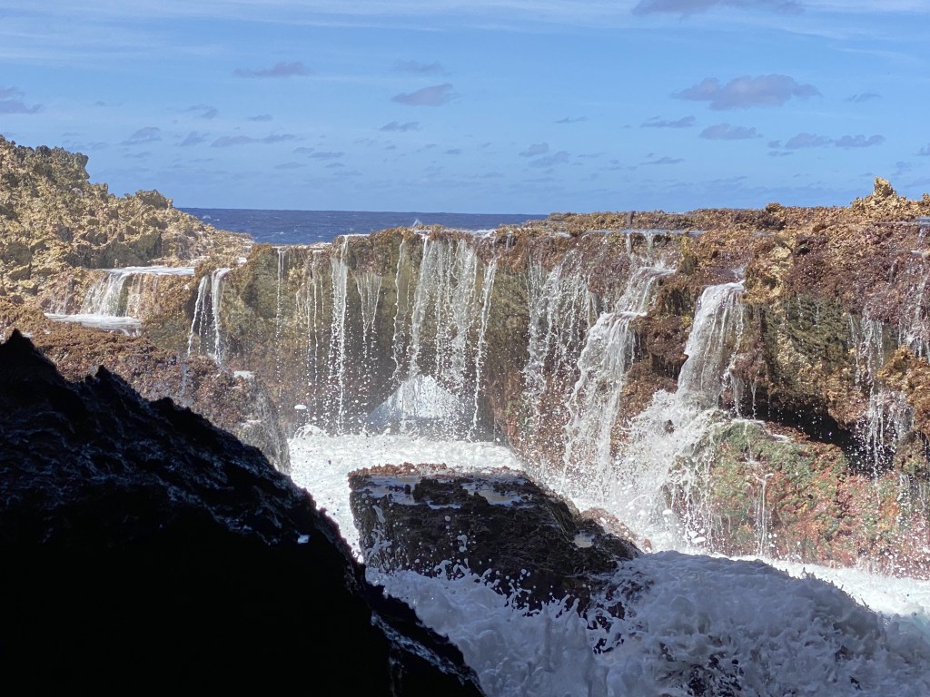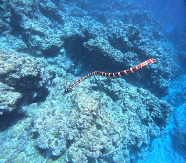 The swell would gently lift us up and down as we floated over the ocean floor.  At one point, a pod of about 40 spinner dolphins swam under me.  I was a bit nervous about the famous Niue water snakes. The katuali or flat-tail sea snake is a species of venomous sea snake, found only in the waters of Niue. They grow to a total length (including tail) of up to 1 m (3.3 ft), and are highly venomous, making it one of the most potentially dangerous creatures on the planet. These snakes are said to be more poisonous than a cobra. With a small mouth and fangs at the back of their throats, they can dislocate their lower jaw to bite.  But they are not interested in us and cannot open their mouths wide enough to bite us.  I saw one almost immediately, as it swam up from a crevice on the ocean floor to the air to take a breath, then back down it went.  Soon, I was seeing them everywhere, so graceful and not at all scary.  One came up behind me and Calder saw him “lick” my flipper.  So thankful that we were able to explore the inner lagoon pools, as well as on the outside reef, two very different experiences.