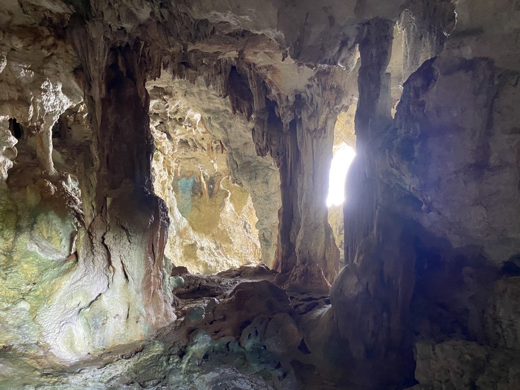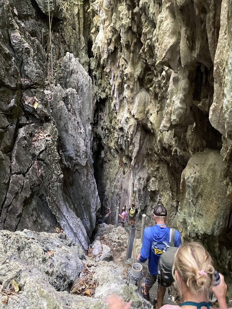 It opened up to an other-worldly landscape of limestone razor-sharp pinnacles, a cemented path winding through to a vertical 28 rung ladder into a surreal oasis below with mature coconut palms.
