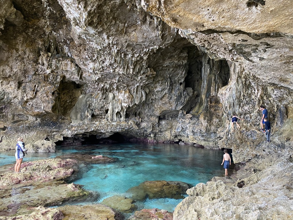 The kids like to wander off, bushwhacking to other small caves in the limestone hills.   We swam in iridescent blues in the Limu pools