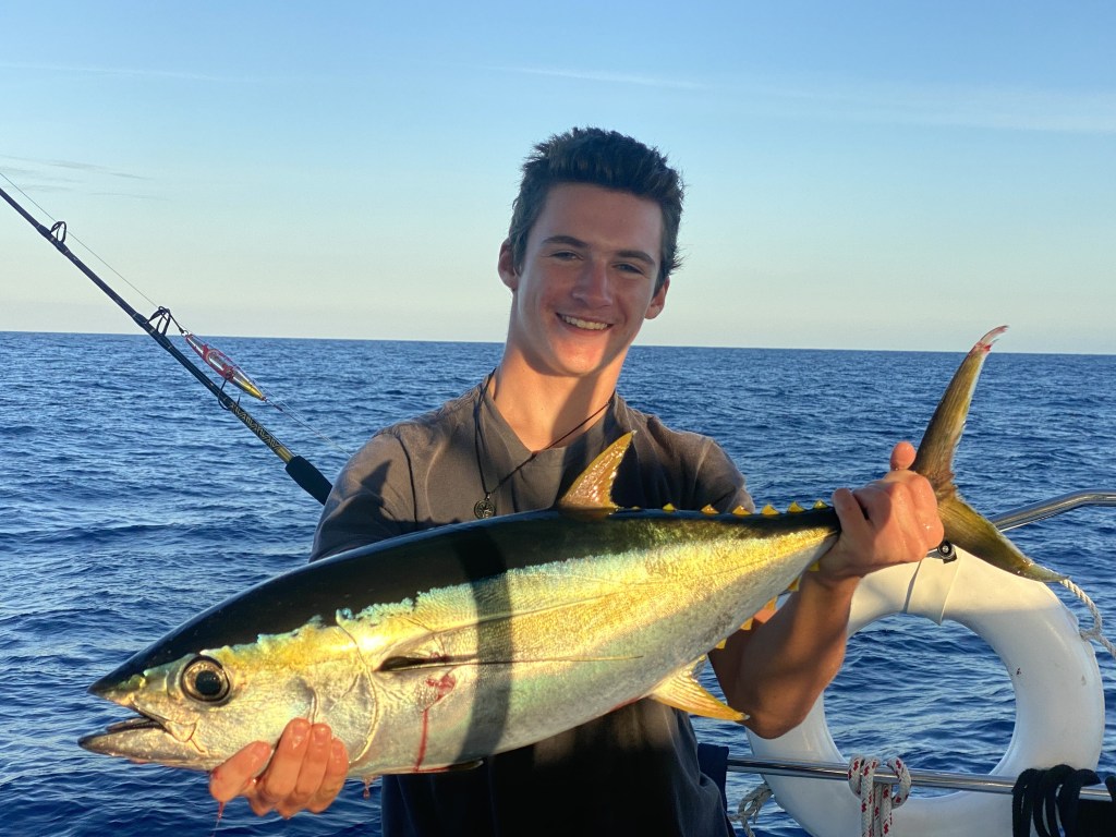 Calder’s fishing line whirs and we are gifted with a sunset yellow fin tuna, which we have not caught since the Marquesas.  We are so lucky; this is our favorite for sashimi, such a high-quality tuna.