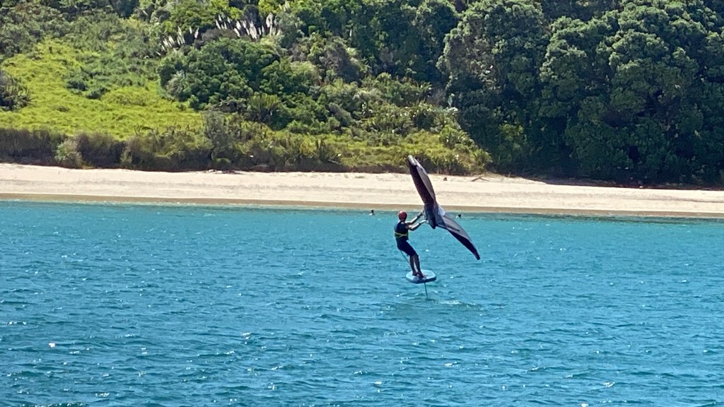 Calder wing-foiling at our New Year’s anchorage