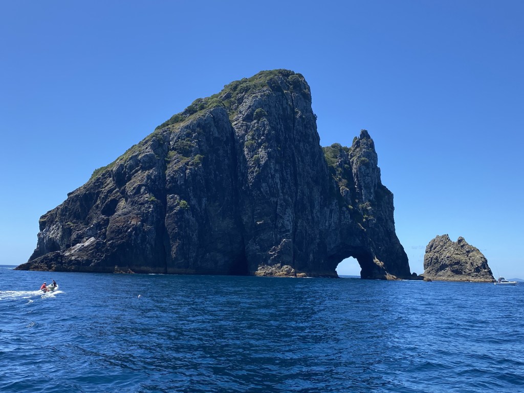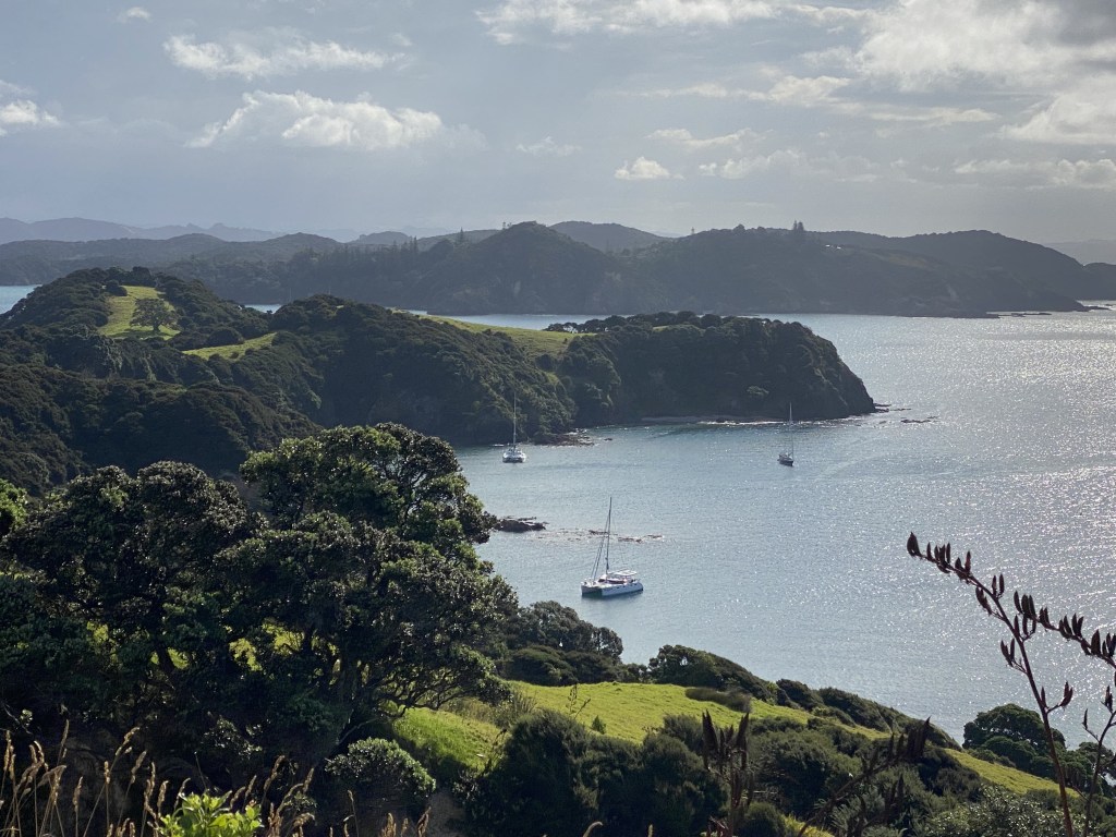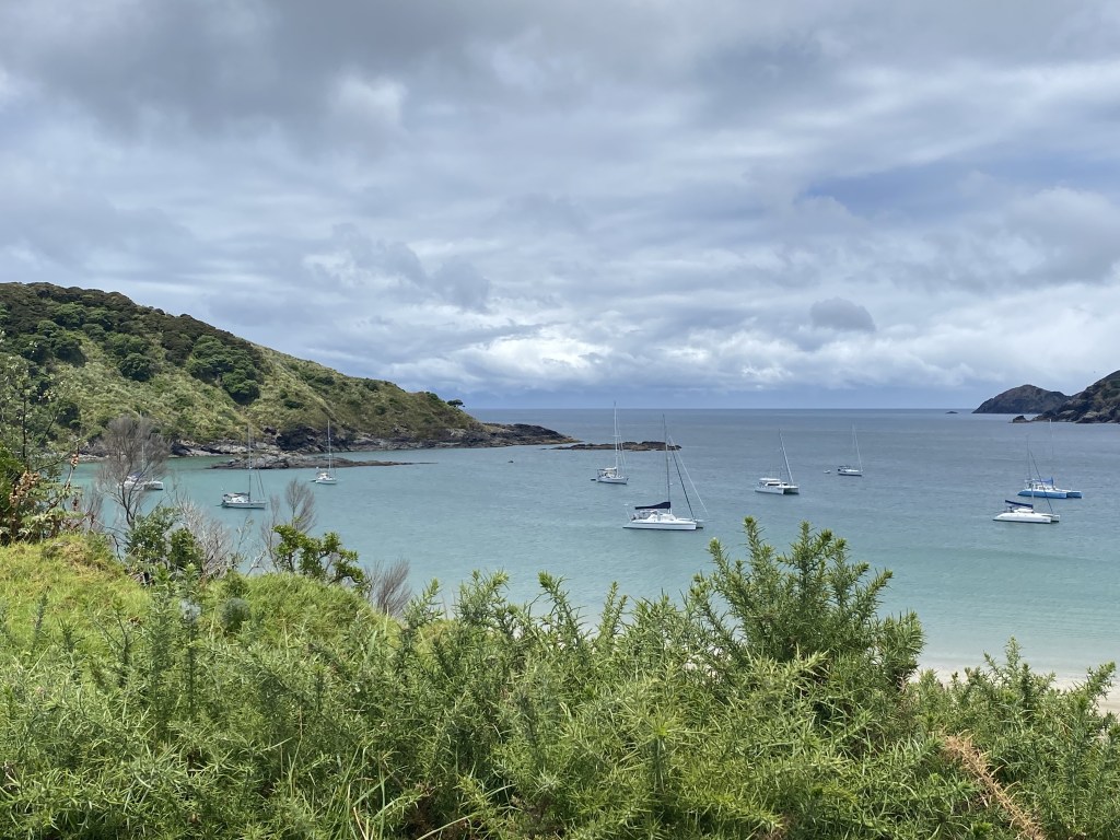 In our first anchorage, a flood of boats arrived at 2pm, making it quite tight… then all left by the evening and we found ourselves in a peaceful anchorage with rocky outcrops and no one on shore, overall striking. We dinghied over to a nearby beach, climbed a steep bluff to find the trail, sinking into spongy plants up to our knees (similar to muskeg, but dry) until we found the trail.  This trail was unique, as we dipped into a darker forest area with the overwhelming sound of bug noise. Who was it?? It was the well named “chorus cicadas.”  The sound of chorus cicadas is a familiar part of summer daytime in New Zealand. Vast numbers of individuals emerge around the same time and in the same place, and the combined volume of their calling is impressively loud, as the males call out to attract females. Cicadas that congregate together have the advantage of safety in numbers and it has been suggested their noise levels might be so off-putting that hungry birds stay away.  We were definitely experiencing the surround sound experience of chorus circadas!
