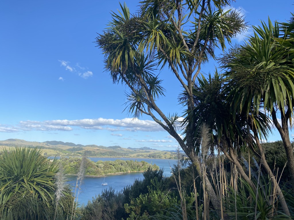 View from hiking trail toward Terikah anchored off Mangonui