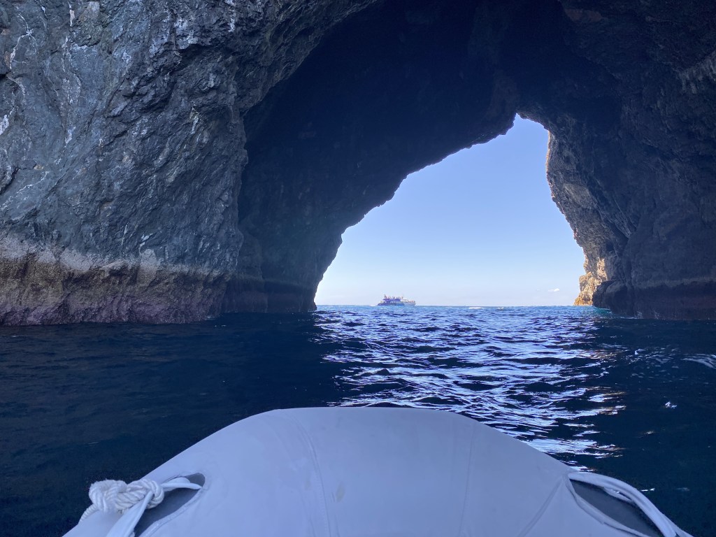 Amazed at how calm the open Pacific Ocean can be on our way to Hole in the Rock, rolling swells as we took turns running the dinghy into the cave and through the massive rock hole, while the other stayed on the boat floating without a good place to anchor.